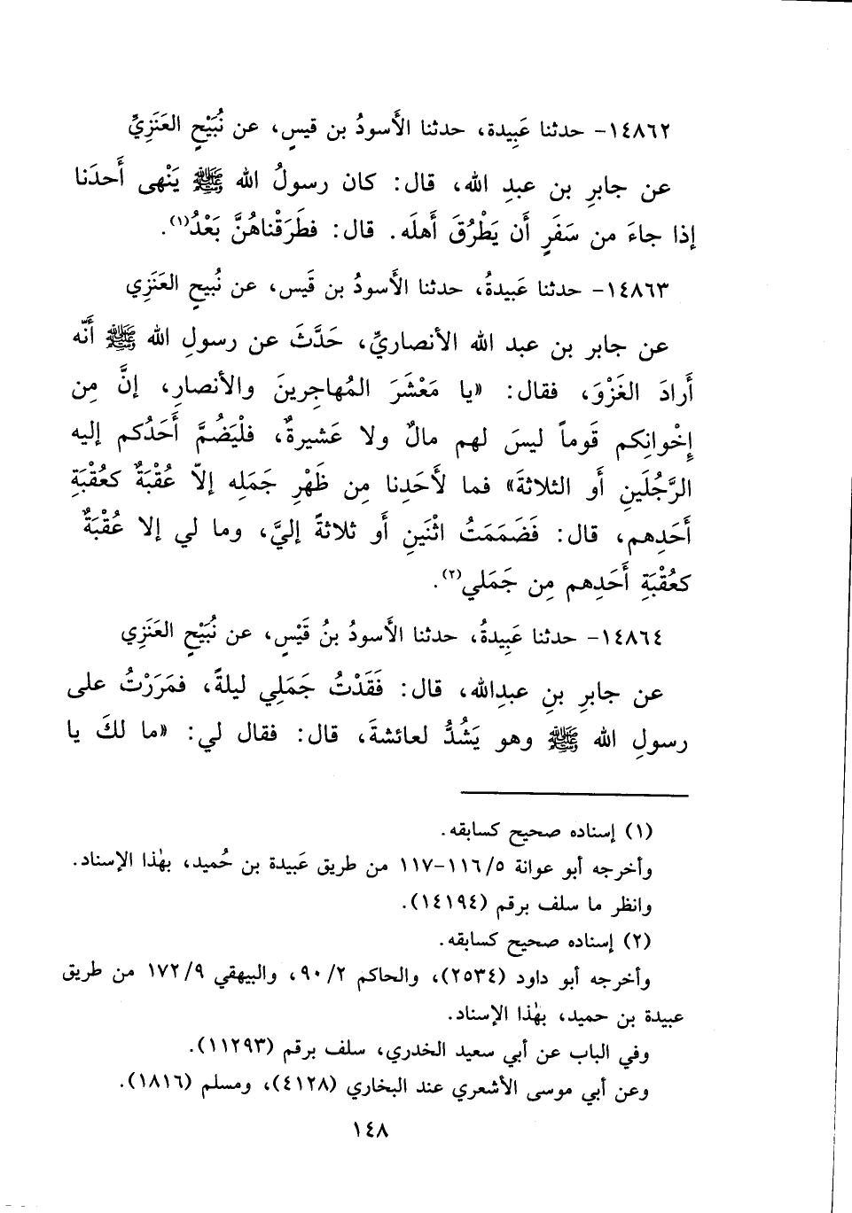 ١٤٨٦٣ - حَدَّثَنَا عَبِيدَةُ، حَدَّثَنَا الْأَسْوَدُ بْنُ قَيْسٍ، عَنْ نُبَيْحٍ الْعَنَزِيِّ، عَنْ جَابِرِ بْنِ عَبْدِ اللهِ الْأَنْصَارِيِّ، حَدَّثَ، عَنْ رَسُولِ اللهِ صَلَّى اللهُ عَلَيْهِ وَسَلَّمَ أَنَّهُ أَرَادَ الْغَزْوَ، فَقَالَ: " يَا مَعْشَرَ الْمُهَاجِرِينَ وَالْأَنْصَارِ، إِنَّ مِنْ إِخْوَانِكُمْ قَوْمًا لَيْسَ لَهُمْ مَالٌ، وَلَا عَشِيرَةٌ، فَلْيَضُمَّ أَحَدُكُمْ إِلَيْهِ الرَّجُلَيْنِ، أَوِ الثَّلَاثَةَ، فَمَا لِأَحَدِنَا مِنْ ظَهْرِ جَمَلِهِ إِلَّا عُقْبَةٌ كَعُقْبَةِ أَحَدِهِمْ "، قَالَ: فَضَمَمْتُ اثْنَيْنِ، أَوْ ثَلَاثَةً إِلَيَّ، وَمَا لِي إِلَّا عُقْبَةٌ كَعُقْبَةِ أَحَدِهِمْ مِنْ جَمَلِي (٢)