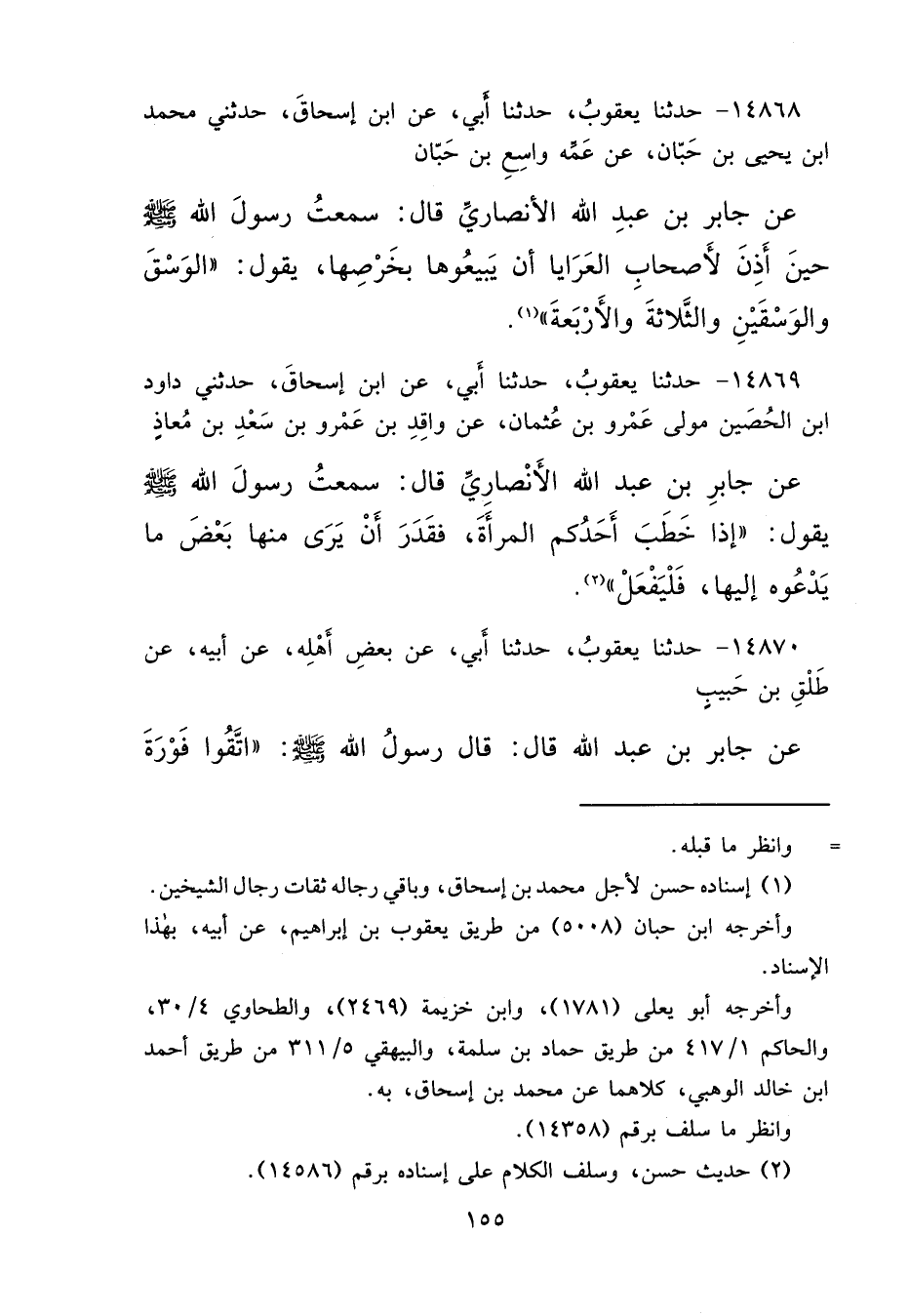 ١٤٨٦٨ - حَدَّثَنَا يَعْقُوبُ، حَدَّثَنَا أَبِي، عَنْ ابْنِ إِسْحَاقَ، حَدَّثَنِي مُحَمَّدُ بْنُ يَحْيَى بْنِ حَبَّانَ، عَنْ عَمِّهِ وَاسِعِ بْنِ حَبَّانَ، عَنْ جَابِرِ بْنِ عَبْدِ اللهِ الْأَنْصَارِيِّ، قَالَ: سَمِعْتُ رَسُولَ اللهِ صَلَّى اللهُ عَلَيْهِ وَسَلَّمَ حِينَ أَذِنَ لِأَصْحَابِ الْعَرَايَا أَنْ يَبِيعُوهَا بِخَرْصِهَا، يَقُولُ: " الْوَسْقَ، وَالْوَسْقَيْنِ، وَالثَّلَاثَةَ، وَالْأَرْبَعَةَ " (١)