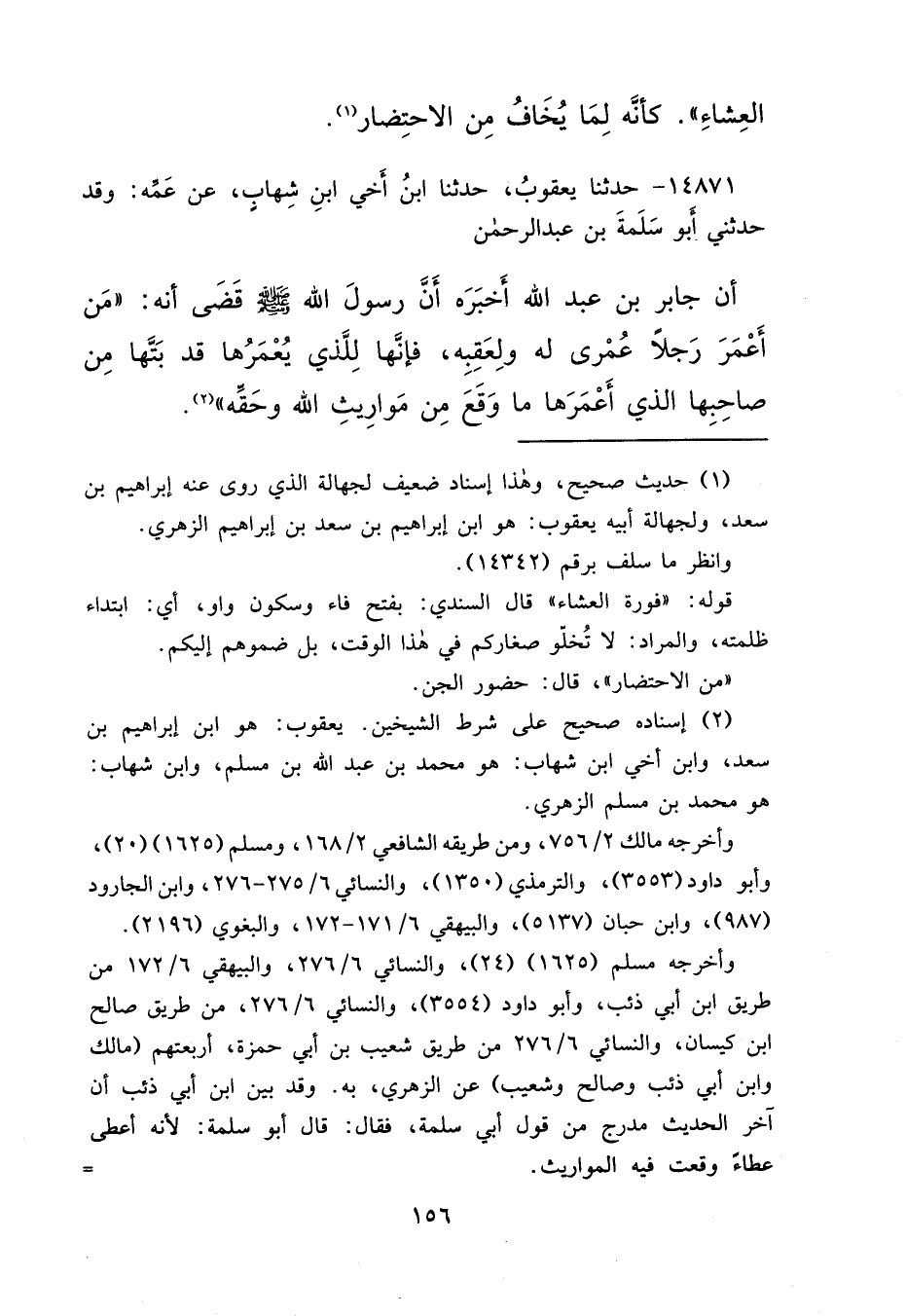 ١٤٨٧١ - حَدَّثَنَا يَعْقُوبُ، حَدَّثَنَا ابْنُ أَخِي بْنِ شِهَابٍ، عَنْ عَمِّهِ، وَقَدْ حَدَّثَنِي أَبُو سَلَمَةَ بْنُ عَبْدِ الرَّحْمَنِ، أَنَّ جَابِرَ بْنَ عَبْدِ اللهِ، أخْبَرَهُ، أَنَّ رَسُولَ اللهِ صَلَّى اللهُ عَلَيْهِ وَسَلَّمَ قَضَى أَنَّهُ: " مَنْ أَعْمَرَ رَجُلًا عُمْرَى لَهُ وَلِعَقِبِهِ، فَإِنَّهَا لِلَّذِي يُعْمَرُهَا قَدْ بَتَّهَا مِنْ صَاحِبِهَا الَّذِي أَعْمَرَهَا مَا وَقَعَ مِنْ مَوَارِيثِ اللهِ وَحَقِّهِ " (٢)