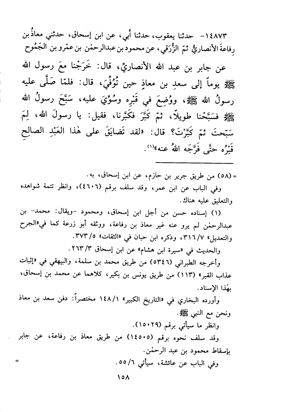 ١٤٨٧٣ - حَدَّثَنَا يَعْقُوبُ، حَدَّثَنَا أَبِي، عَنْ ابْنِ إِسْحَاقَ، حَدَّثَنِي مُعَاذُ بْنُ رِفَاعَةَ الْأَنْصَارِيُّ ثُمَّ الزُّرَقِيُّ، عَنْ مَحْمُودِ بْنِ عَبْدِ الرَّحْمَنِ بْنِ عَمْرِو بْنِ الْجَمُوحِ، عَنْ جَابِرِ بْنِ عَبْدِ اللهِ الْأَنْصَارِيِّ، قَالَ: خَرَجْنَا مَعَ رَسُولِ اللهِ صَلَّى اللهُ عَلَيْهِ وَسَلَّمَ يَوْمًا إِلَى سَعْدِ بْنِ مُعَاذٍ حِينَ تُوُفِّيَ، قَالَ: فَلَمَّا صَلَّى عَلَيْهِ رَسُولُ اللهِ صَلَّى اللهُ عَلَيْهِ وَسَلَّمَ وَوُضِعَ فِي قَبْرِهِ وَسُوِّيَ عَلَيْهِ، سَبَّحَ رَسُولُ اللهِ صَلَّى اللهُ عَلَيْهِ وَسَلَّمَ، فَسَبَّحْنَا طَوِيلًا، ثُمَّ كَبَّرَ فَكَبَّرْنَا، فَقِيلَ: يَا رَسُولَ اللهِ، لِمَ سَبَّحْتَ؟ ثُمَّ كَبَّرْتَ؟ قَالَ: " لَقَدْ تَضَايَقَ عَلَى هَذَا الْعَبْدِ الصَّالِحِ قَبْرُهُ حَتَّى فَرَّجَهُ اللهُ عَنْهُ " (١)