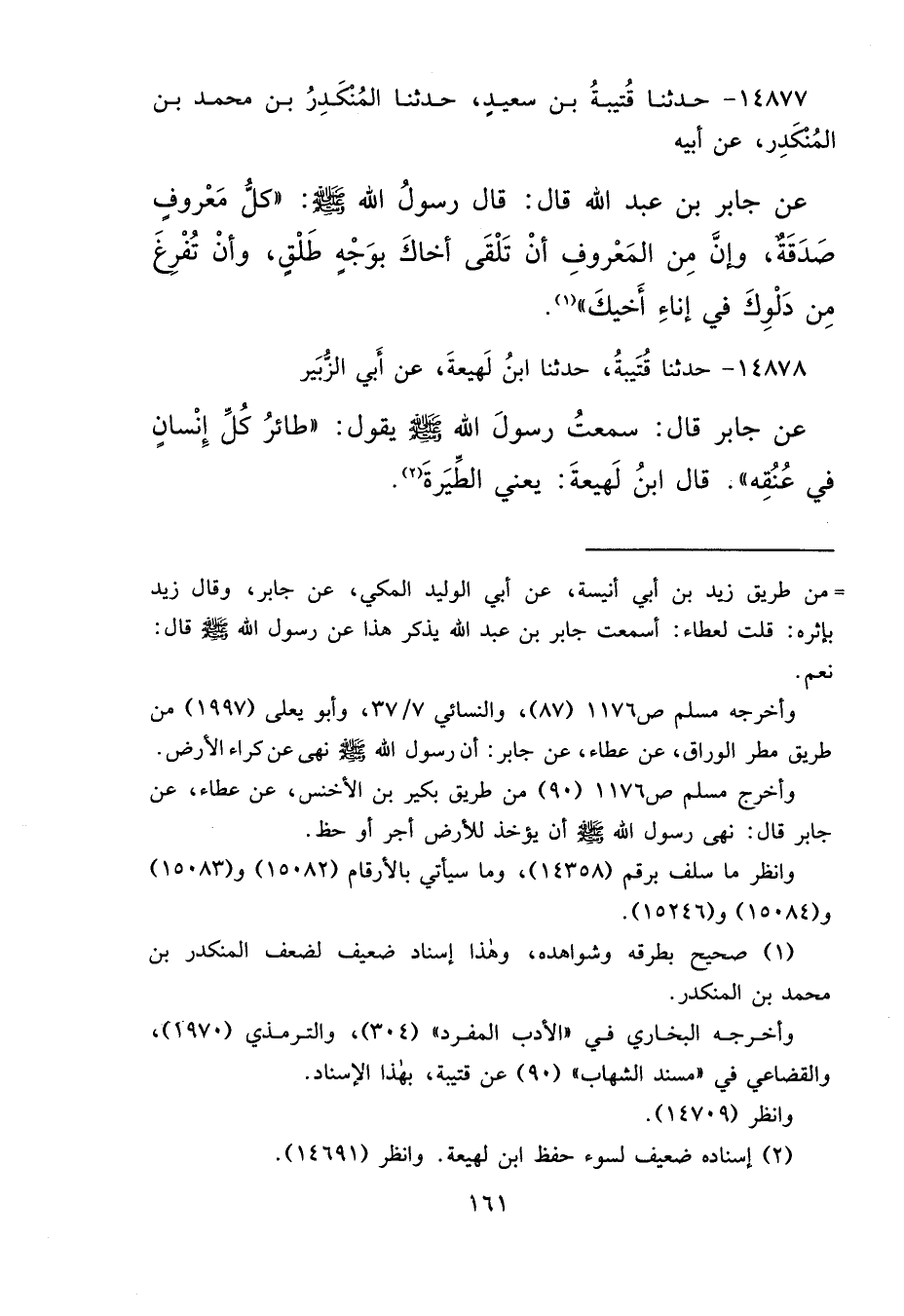 ١٤٨٧٧ - حَدَّثَنَا قُتَيْبَةُ بْنُ سَعِيدٍ، حَدَّثَنَا الْمُنْكَدِرُ بْنُ مُحَمَّدِ بْنِ الْمُنْكَدِرِ، عَنْ أَبِيهِ، عَنْ جَابِرِ بْنِ عَبْدِ اللهِ، قَالَ: قَالَ رَسُولُ اللهِ صَلَّى اللهُ عَلَيْهِ وَسَلَّمَ: " كُلُّ مَعْرُوفٍ صَدَقَةٌ، وَإِنَّ مِنَ الْمَعْرُوفِ أَنْ تَلْقَى أَخَاكَ بِوَجْهٍ طَلْقٍ، وَأَنْ تُفْرِغَ مِنْ دَلْوِكَ فِي إِنَاءِ أَخِيكَ " (١)