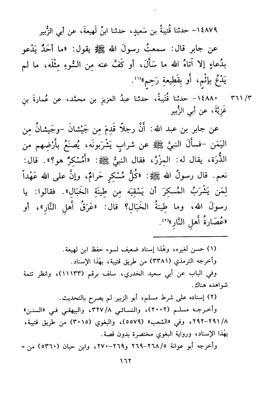 ١٤٨٧٩ - حَدَّثَنَا قُتَيْبَةُ بْنُ سَعِيدٍ، حَدَّثَنَا ابْنُ لَهِيعَةَ، عَنْ أَبِي الزُّبَيْرِ، عَنْ جَابِرٍ، قَالَ: سَمِعْتُ رَسُولَ اللهِ صَلَّى اللهُ عَلَيْهِ وَسَلَّمَ يَقُولُ: " مَا أَحَدٌ يَدْعُو بِدُعَاءٍ إِلَّا آتَاهُ اللهُ مَا سَأَلَ، أَوْ كَفَّ عَنْهُ مِنَ السُّوءِ مِثْلَهُ، مَا لَمْ يَدْعُ بِإِثْمٍ، أَوْ بِقَطِيعَةِ رَحِمٍ " (١)
