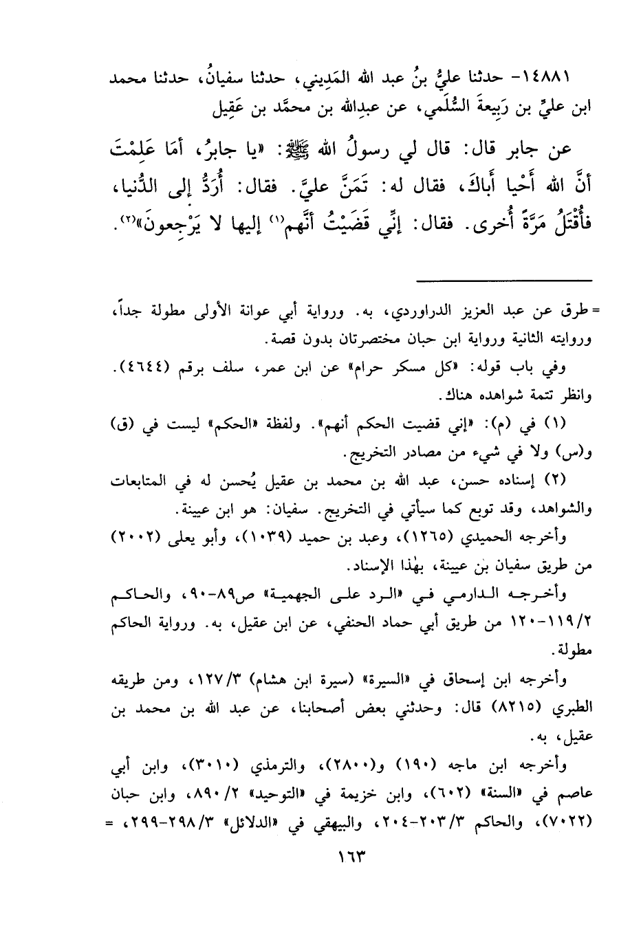 ١٤٨٨١ - حَدَّثَنَا عَلِيُّ بْنُ عَبْدِ اللهِ الْمَدِينِيُّ، حَدَّثَنَا سُفْيَانُ، حَدَّثَنَا مُحَمَّدُ بْنُ عَلِيِّ بْنِ رَبِيعَةَ السُّلَمِيُّ، عَنْ عَبْدِ اللهِ بْنِ مُحَمَّدِ بْنِ عَقِيلٍ، عَنْ جَابِرٍ، قَالَ: قَالَ لِي رَسُولُ اللهِ صَلَّى اللهُ عَلَيْهِ وَسَلَّمَ: " يَا جَابِرُ، أَمَا عَلِمْتَ أَنَّ اللهَ عَزَّ وَجَلَّ أَحْيَا أَبَاكَ، فَقَالَ لَهُ: تَمَنَّ عَلَيَّ، فَقَالَ: أُرَدُّ إِلَى الدُّنْيَا، فَأُقْتَلُ مَرَّةً أُخْرَى، فَقَالَ: إِنِّي قَضَيْتُ، أَنَّهُمْ (١) إِلَيْهَا لَا يُرْجَعُونَ " (٢)