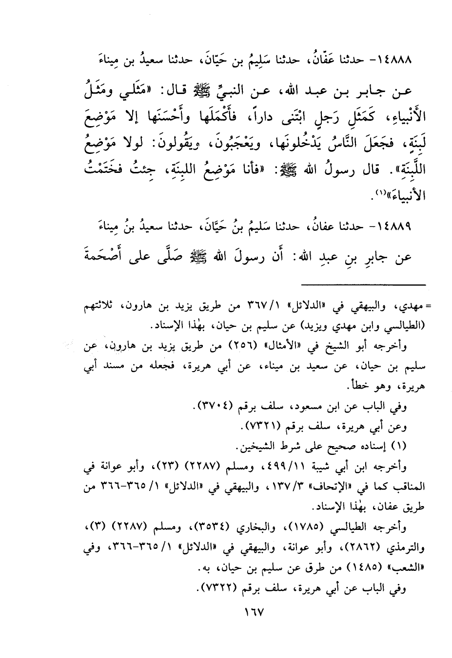 ١٤٨٨٨ - حَدَّثَنَا عَفَّانُ، حَدَّثَنَا سَلِيمُ بْنُ حَيَّانَ، حَدَّثَنَا سَعِيدُ بْنُ مِينَاءَ، عَنْ جَابِرِ بْنِ عَبْدِ اللهِ، عَنِ النَّبِيِّ صَلَّى اللهُ عَلَيْهِ وَسَلَّمَ قَالَ: " مَثَلِي وَمَثَلُ الْأَنْبِيَاءِ كَمَثَلِ رَجُلٍ ابْتَنَى دَارًا فَأَكْمَلَهَا وَأَحْسَنَهَا، إِلَّا مَوْضِعَ لَبِنَةٍ، فَجَعَلَ النَّاسُ يَدْخُلُونَهَا وَيَعْجَبُونَ، وَيَقُولُونَ: لَوْلَا مَوْضِعُ اللَّبِنَةِ "، قَالَ رَسُولُ اللهِ صَلَّى اللهُ عَلَيْهِ وَسَلَّمَ: " فَأَنَا مَوْضِعُ اللَّبِنَةِ، جِئْتُ فَخَتَمْتُ الْأَنْبِيَاءَ " (١)