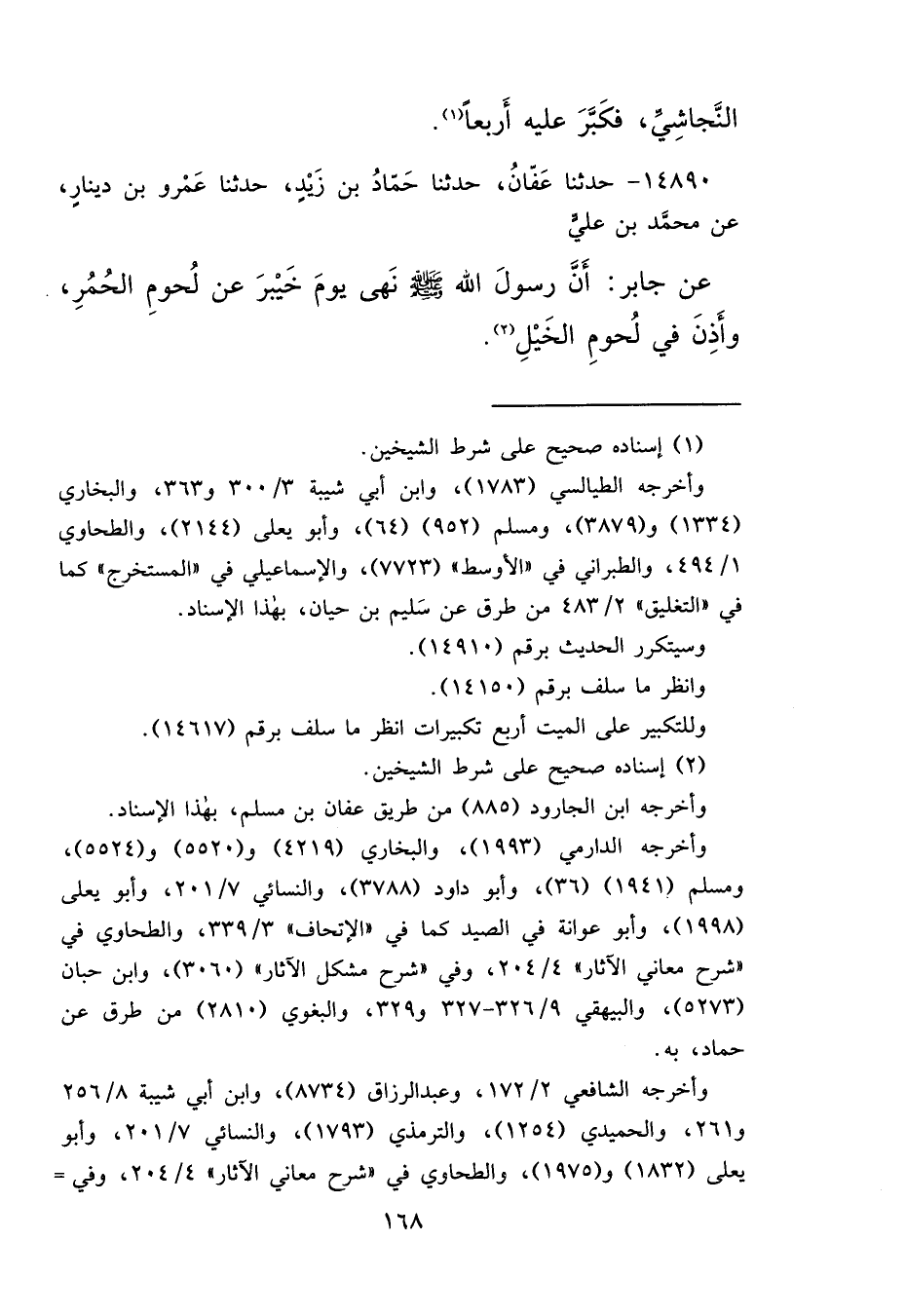 ١٤٨٩٠ - حَدَّثَنَا عَفَّانُ، حَدَّثَنَا حَمَّادُ بْنُ زَيْدٍ، حَدَّثَنَا عَمْرُو بْنُ دِينَارٍ، عَنْ مُحَمَّدِ بْنِ عَلِيٍّ، عَنْ جَابِرٍ، " أَنَّ رَسُولَ اللهِ صَلَّى اللهُ عَلَيْهِ وَسَلَّمَ نَهَى يَوْمَ خَيْبَرَ عَنْ لُحُومِ الْحُمُرِ، وَأَذِنَ فِي لُحُومِ الْخَيْلِ " (٢)