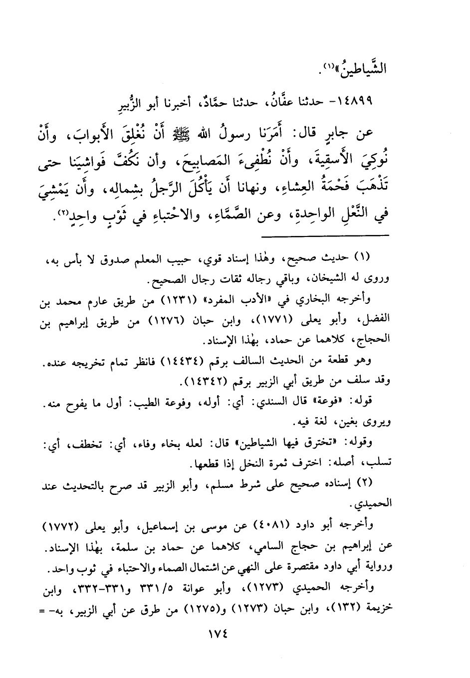 ١٤٨٩٩ - حَدَّثَنَا عَفَّانُ، حَدَّثَنَا حَمَّادٌ، أَخْبَرَنَا أَبُو الزُّبَيْرِ، عَنْ جَابِرٍ، قَالَ: " أَمَرَنَا رَسُولُ اللهِ صَلَّى اللهُ عَلَيْهِ وَسَلَّمَ أَنْ نُغْلِقَ الْأَبْوَابَ، وَأَنْ نُوكِي الْأَسْقِيَةَ، وَأَنْ نُطْفِئَ الْمَصَابِيحَ، وَأَنْ نَكُفَّ فَوَاشِيَنَا حَتَّى تَذْهَبَ فَحْمَةُ الْعِشَاءِ، وَنَهَانَا أَنْ يَأْكُلَ الرَّجُلُ بِشِمَالِهِ، وَأَنْ يَمْشِيَ فِي النَّعْلِ الْوَاحِدَةِ، وَعَنِ الصَّمَّاءِ وَالِاحْتِبَاءِ فِي ثَوْبٍ وَاحِدٍ " (٢)