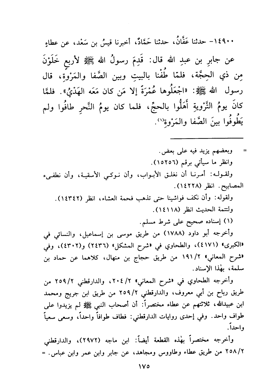 ١٤٩٠٠ - حَدَّثَنَا عَفَّانُ، حَدَّثَنَا حَمَّادٌ، أَخْبَرَنَا قَيْسُ بْنُ سَعْدٍ، عَنْ عَطَاءٍ، عَنْ جَابِرِ بْنِ عَبْدِ اللهِ، قَالَ: قَدِمَ رَسُولُ اللهِ صَلَّى اللهُ عَلَيْهِ وَسَلَّمَ لِأَرْبَعٍ خَلَوْنَ مِنْ ذِي الْحِجَّةِ، فَلَمَّا طُفْنَا بِالْبَيْتِ، وَبَيْنَ الصَّفَا وَالْمَرْوَةِ، قَالَ رَسُولُ اللهِ صَلَّى اللهُ عَلَيْهِ وَسَلَّمَ: " اجْعَلُوهَا عُمْرَةً إِلَّا مَنْ كَانَ مَعَهُ الْهَدْيُ "، فَلَمَّا كَانَ يَوْمُ التَّرْوِيَةِ، أَهَلُّوا بِالْحَجِّ، فَلَمَّا كَانَ يَوْمُ النَّحْرِ، طَافُوا وَلَمْ يَطُوفُوا بَيْنَ الصَّفَا وَالْمَرْوَةِ (١)