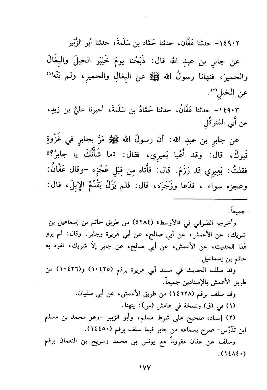 ١٤٩٠٢ - حَدَّثَنَا عَفَّانُ، حَدَّثَنَا حَمَّادُ بْنُ سَلَمَةَ، حَدَّثَنَا أَبُو الزُّبَيْرِ، عَنْ جَابِرِ بْنِ عَبْدِ اللهِ قَالَ: " ذَبَحْنَا يَوْمَ خَيْبَرَ الْخَيْلَ وَالْبِغَالَ وَالْحَمِيرَ، فَنَهَانَا رَسُولُ اللهِ صَلَّى اللهُ عَلَيْهِ وَسَلَّمَ عَنِ الْبِغَالِ وَالْحَمِيرِ، وَلَمْ يَنْهَ (١) عَنِ الْخَيْلِ " (٢)