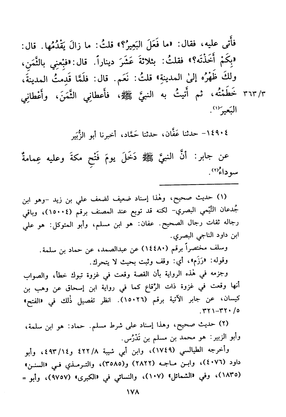 ١٤٩٠٤ - حَدَّثَنَا عَفَّانُ، حَدَّثَنَا حَمَّادٌ، أَخْبَرَنَا أَبُو الزُّبَيْرِ، عَنْ جَابِرٍ، أَنَّ النَّبِيُّ صَلَّى اللهُ عَلَيْهِ وَسَلَّمَ: " دَخَلَ يَوْمَ فَتْحِ مَكَّةَ وَعَلَيْهِ عِمَامَةٌ سَوْدَاءُ " (٢)