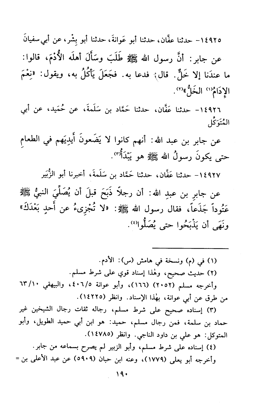 ١٤٩٢٥ - حَدَّثَنَا عَفَّانُ، حَدَّثَنَا أَبُو عَوَانَةَ، حَدَّثَنَا أَبُو بِشْرٍ، عَنْ أَبِي سُفْيَانَ، عَنْ جَابِرٍ، أَنَّ رَسُولَ اللهِ صَلَّى اللهُ عَلَيْهِ وَسَلَّمَ طَلَبَ وَسَأَلَ أَهْلَهُ الْأُدْمَ، قَالَوا: مَا عِنْدَنَا إِلَّا خَلٌّ، قَالَ: فَدَعَا بِهِ، فَجَعَلَ يَأْكُلُ بِهِ، وَيَقُولُ: " نِعْمَ الْأُدْمُ (١) الْخَلُّ " (٢)