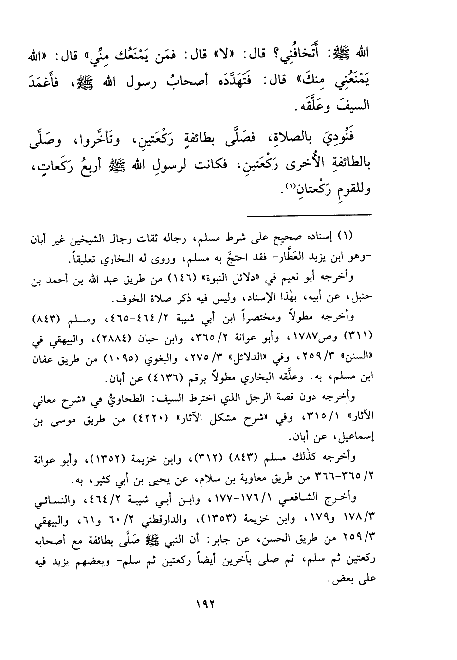 اللهِ صَلَّى اللهُ عَلَيْهِ وَسَلَّمَ: أَتَخَافُنِي؟ قَالَ: " لَا "، قَالَ: فَمَنْ يَمْنَعُكَ مِنِّي؟ قَالَ: " اللهُ يَمْنَعُنِي مِنْكَ "، قَالَ: فَتَهَدَّدَهُ أَصْحَابُ رَسُولِ اللهِ صَلَّى اللهُ عَلَيْهِ وَسَلَّمَ، فَأَغْمَدَ السَّيْفَ وَعَلَّقَهُ، فَنُودِيَ بِالصَّلَاةِ، فَصَلَّى بِطَائِفَةٍ رَكْعَتَيْنِ، وَتَأَخَّرُوا وَصَلَّى بِالطَّائِفَةِ الْأُخْرَى رَكْعَتَيْنِ، فَكَانَتْ لِرَسُولِ اللهِ صَلَّى اللهُ عَلَيْهِ وَسَلَّمَ أَرْبَعُ رَكَعَاتٍ، وَلِلْقَوْمِ رَكْعَتَانِ (١)