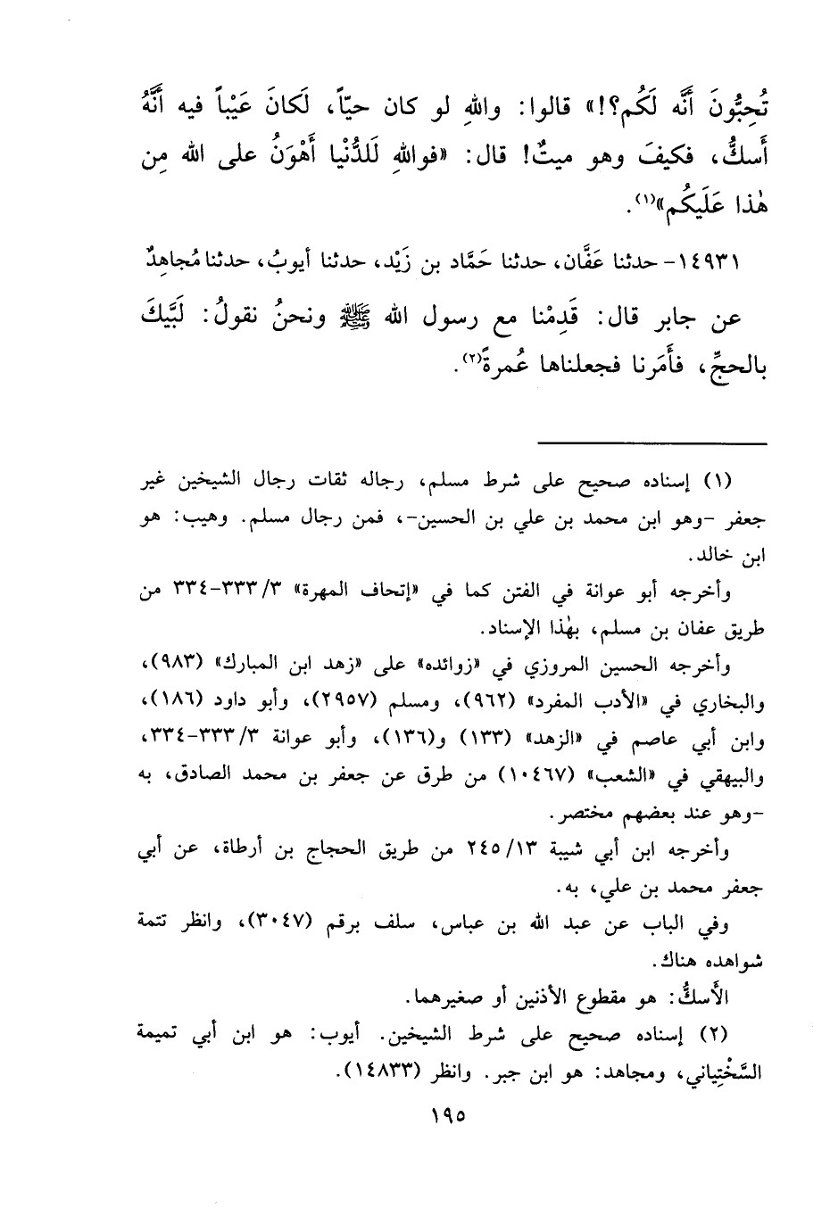 ١٤٩٣١ - حَدَّثَنَا عَفَّانُ، حَدَّثَنَا حَمَّادُ بْنُ زَيْدٍ، حَدَّثَنَا أَيُّوبُ، حَدَّثَنَا مُجَاهِدٌ، عَنْ جَابِرٍ، قَالَ: " قَدِمْنَا مَعَ رَسُولِ اللهِ صَلَّى اللهُ عَلَيْهِ وَسَلَّمَ وَنَحْنُ نَقُولُ: لَبَّيْكَ بِالْحَجِّ، فَأَمَرَنَا فَجَعَلْنَاهَا عُمْرَةً " (٢)