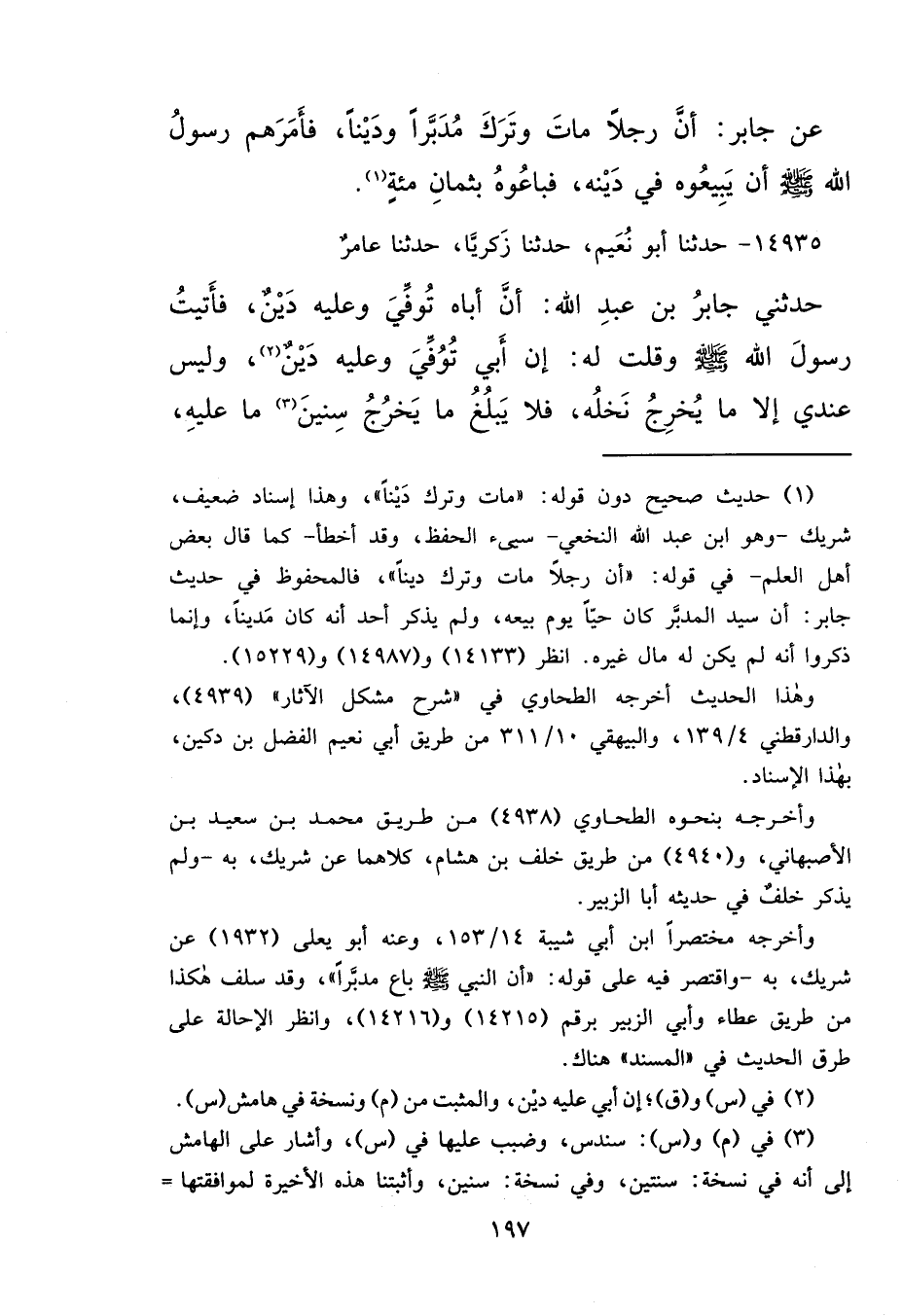 ١٤٩٣٥ - حَدَّثَنَا أَبُو نُعَيْمٍ، حَدَّثَنَا زَكَرِيَّا، حَدَّثَنَا عَامِرٌ، حَدَّثَنِي جَابِرُ بْنُ عَبْدِ اللهِ، أَنَّ أَبَاهُ تُوُفِّيَ وَعَلَيْهِ دَيْنٌ، فَأَتَيْتُ رَسُولَ اللهِ صَلَّى اللهُ عَلَيْهِ وَسَلَّمَ، وَقُلْتُ لَهُ: إِنَّ أَبِي تُوُفِّيَ وَعَلَيْهِ دَيْنٌ، (٢) وَلَيْسَ عِنْدِي إِلَّا مَا يُخْرِجُ نَخْلُهُ، فَلَا يَبْلُغُ مَا يَخْرُجُ سِنِينَ (٣) مَا عَلَيْهِ،