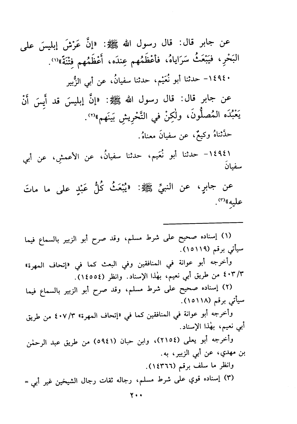 ١٤٩٤٠ - حَدَّثَنَا أَبُو نُعَيْمٍ، حَدَّثَنَا سُفْيَانُ، عَنْ أَبِي الزُّبَيْرِ، عَنْ جَابِرٍ، قَالَ: قَالَ رَسُولُ اللهِ صَلَّى اللهُ عَلَيْهِ وَسَلَّمَ: " إِنَّ إِبْلِيسَ قَدْ أَيِسَ أَنْ يَعْبُدَهُ الْمُصَلُّونَ، وَلَكِنْ فِي التَّحْرِيشِ بَيْنَهُمْ " (٢) ، حَدَّثَنَاهُ وَكِيعٌ، عَنْ سُفْيَانَ مَعْنَاهُ