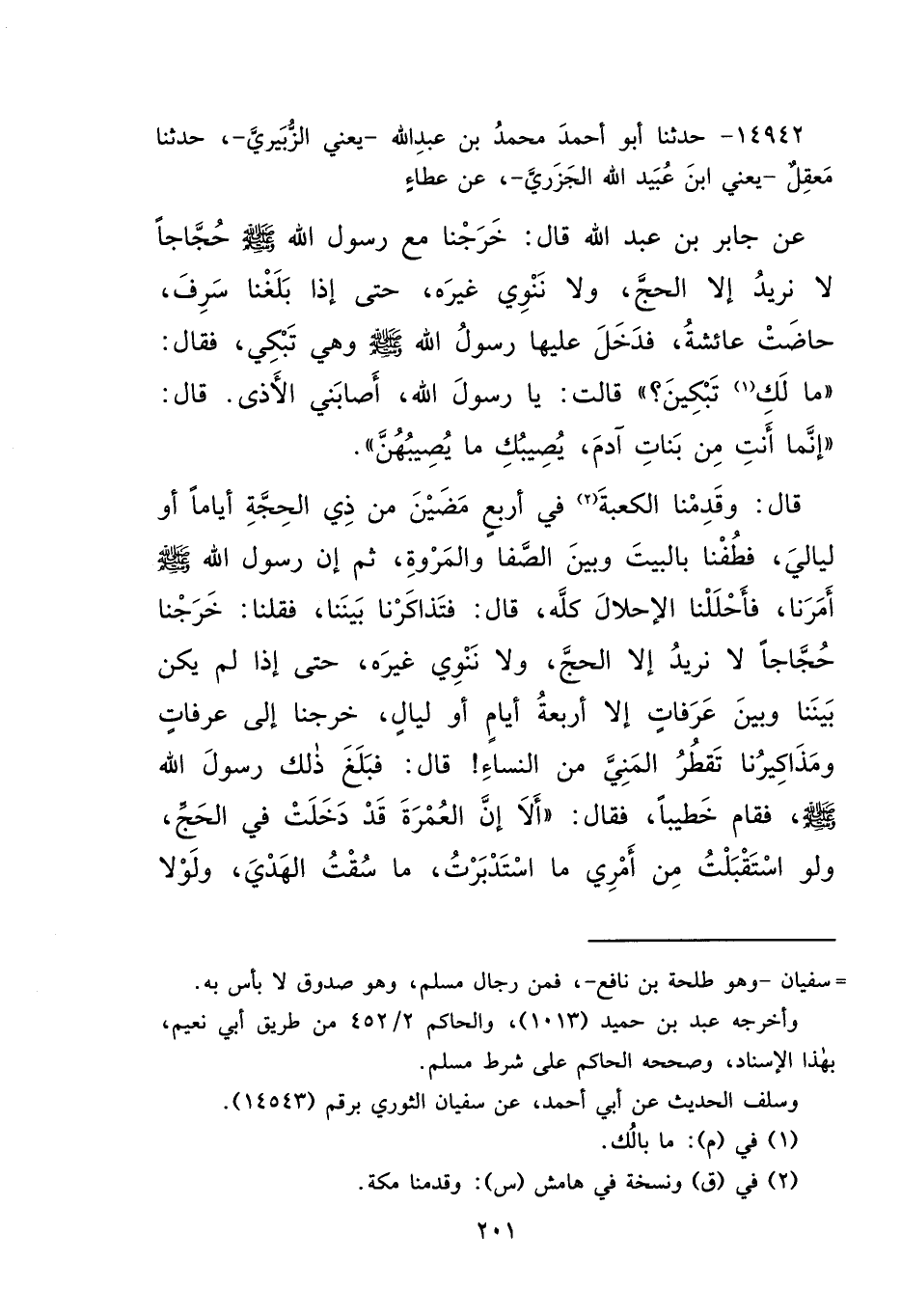 ١٤٩٤٢ - حَدَّثَنَا أَبُو أَحْمَدَ مُحَمَّدُ بْنُ عَبْدِ اللهِ يَعْنِي الزُّبَيْرِيَّ، حَدَّثَنَا مَعْقِلٌ يَعْنِي ابْنَ عُبَيْدِ اللهِ الْجَزَرِيَّ، عَنْ عَطَاءٍ، عَنْ جَابِرِ بْنِ عَبْدِ اللهِ، قَالَ: خَرَجْنَا مَعَ رَسُولِ اللهِ صَلَّى اللهُ عَلَيْهِ وَسَلَّمَ حُجَّاجًا، لَا نُرِيدُ إِلَّا الْحَجَّ، وَلَا نَنْوِي غَيْرَهُ، حَتَّى إِذَا بَلَغْنَا سَرِفَ، حَاضَتْ عَائِشَةُ، فَدَخَلَ عَلَيْهَا رَسُولُ اللهِ صَلَّى اللهُ عَلَيْهِ وَسَلَّمَ، وَهِيَ تَبْكِي، فَقَالَ: " مَا لَكِ (١) تَبْكِينَ؟ " قَالَتْ: يَا رَسُولَ اللهِ، أَصَابَنِي الْأَذَى، قَالَ: " إِنَّمَا أَنْتِ مِنْ بَنَاتِ آدَمَ يُصِيبُكِ مَا يُصِيبُهُنَّ "، قَالَ: وَقَدِمْنَا الْكَعْبَةَ (٢) فِي أَرْبَعٍ مَضَيْنَ مِنْ ذِي الْحِجَّةِ أَيَّامًا، أَوْ لَيَالِيَ، فَطُفْنَا بِالْبَيْتِ، وَبَيْنَ الصَّفَا وَالْمَرْوَةِ، ثُمَّ إِنَّ رَسُولَ اللهِ صَلَّى اللهُ عَلَيْهِ وَسَلَّمَ أَمَرَنَا فَأَحْلَلْنَا الْإِحْلَالَ كُلَّهُ، قَالَ: فَتَذَاكَرْنَا بَيْنَنَا، فَقُلْنَا: خَرَجْنَا حُجَّاجًا لَا نُرِيدُ إِلَّا الْحَجَّ، وَلَا نَنْوِي غَيْرَهُ، حَتَّى إِذَا لَمْ يَكُنْ بَيْنَنَا وَبَيْنَ عَرَفَاتٍ إِلَّا أَرْبَعَةُ أَيَّامٍ أَوْ لَيَالٍ، خَرَجْنَا إِلَى عَرَفَاتٍ، وَمَذَاكِيرُنَا تَقْطُرُ الْمَنِيَّ مِنَ النِّسَاءِ، قَالَ: فَبَلَغَ ذَلِكَ رَسُولَ اللهِ صَلَّى اللهُ عَلَيْهِ وَسَلَّمَ، فَقَامَ خَطِيبًا، فَقَالَ: " أَلَا إِنَّ الْعُمْرَةَ قَدْ دَخَلَتْ فِي الْحَجِّ، وَلَوِ اسْتَقْبَلْتُ مِنْ أَمْرِي مَا اسْتَدْبَرْتُ مَا سُقْتُ الْهَدْيَ، وَلَوْلَا