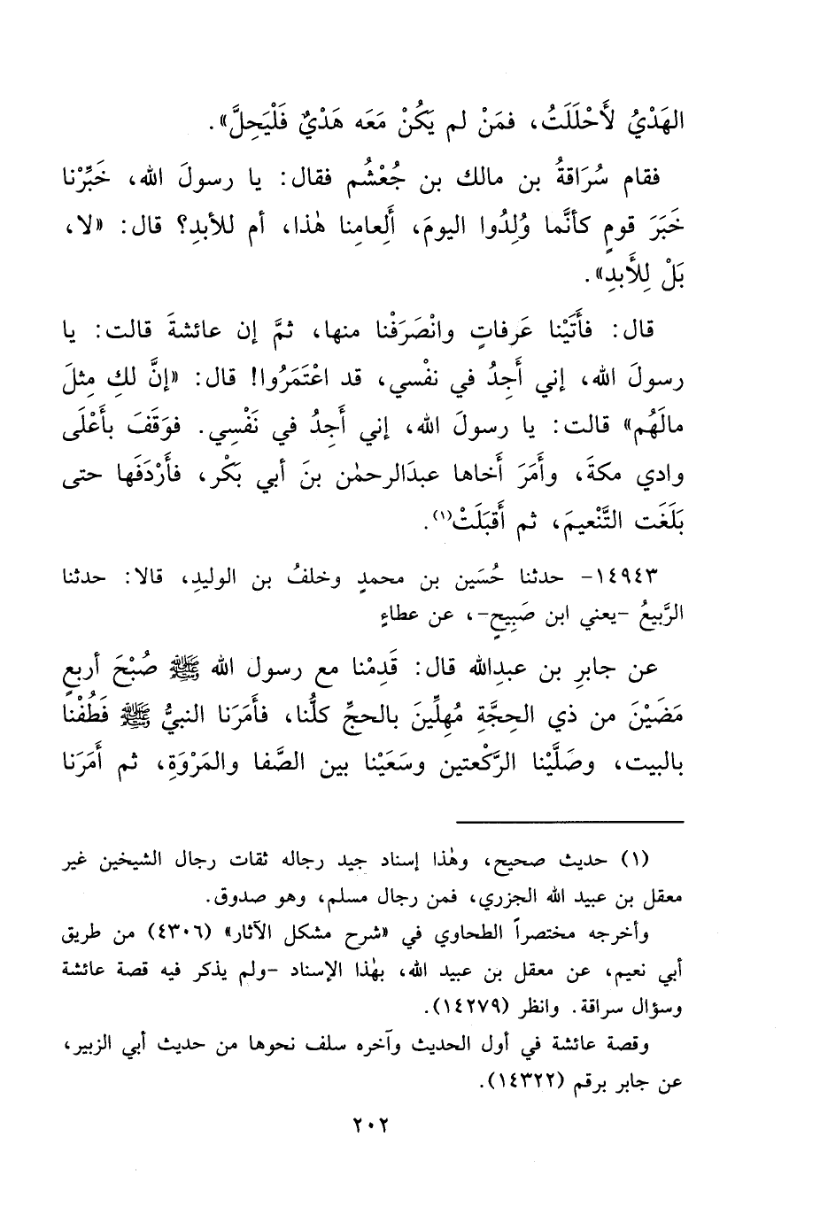 الْهَدْيُ لَأَحْلَلْتُ، فَمَنْ لَمْ يَكُنْ مَعَهُ هَدْيٌ، فَلْيَحِلَّ "، فَقَامَ سُرَاقَةُ بْنُ مَالِكِ بْنِ جُعْشُمٍ، فَقَالَ: يَا رَسُولَ اللهِ، خَبِّرْنَا خَبَرَ قَوْمٍ كَأَنَّمَا وُلِدُوا الْيَوْمَ، أَلِعَامِنَا هَذَا أَمْ لِلْأَبَدِ؟ قَالَ: " لَا بَلْ لِلْأَبَدِ " قَالَ: فَأَتَيْنَا عَرَفَاتٍ، وَانْصَرَفْنَا مِنْهَا، ثُمَّ إِنَّ عَائِشَةَ قَالَتْ: يَا رَسُولَ اللهِ، إِنِّي أَجِدُ فِي نَفْسِي قَدِ اعْتَمَرُوا، قَالَ: " إِنَّ لَكِ مِثْلَ مَا لَهُمْ " قَالَتْ: يَا رَسُولَ اللهِ، إِنِّي أَجِدُ فِي نَفْسِي، فَوَقَفَ بِأَعْلَى وَادِي مَكَّةَ، وَأَمَرَ أَخَاهَا عَبْدَ الرَّحْمَنِ بْنَ أَبِي بَكْرٍ، فَأَرْدَفَهَا حَتَّى بَلَغَتِ التَّنْعِيمَ، ثُمَّ أَقْبَلَتْ (١)