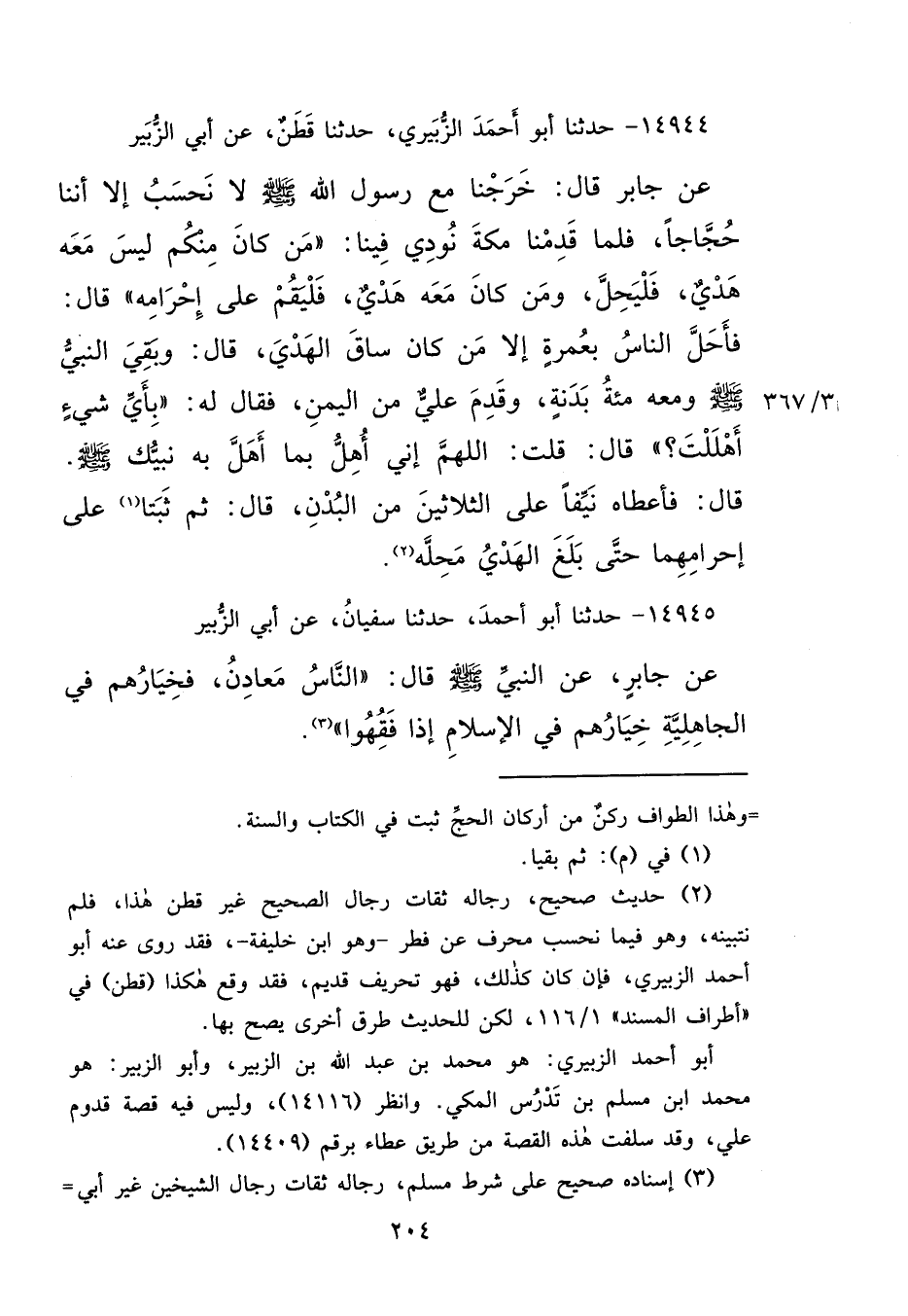 ١٤٩٤٤ - حَدَّثَنَا أَبُو أَحْمَدَ الزُّبَيْرِيُّ، حَدَّثَنَا قَطَنٌ، عَنْ أَبِي الزُّبَيْرِ، عَنْ جَابِرٍ، قَالَ: خَرَجْنَا مَعَ رَسُولِ اللهِ صَلَّى اللهُ عَلَيْهِ وَسَلَّمَ لَا نَحْسِبُ إِلَّا أَنَّنَا حُجَّاجًا، فَلَمَّا قَدِمْنَا مَكَّةَ نُودِيَ فِينَا: مَنْ كَانَ مِنْكُمْ لَيْسَ مَعَهُ هَدْيٌ فَلْيَحِلَّ، وَمَنْ كَانَ مَعَهُ هَدْيٌ، فَلْيُقِمْ عَلَى إِحْرَامِهِ، قَالَ: فَأَحَلَّ النَّاسُ بِعُمْرَةٍ إِلَّا مَنْ كَانَ سَاقَ الْهَدْيَ، قَالَ: وَبَقِيَ النَّبِيُّ صَلَّى اللهُ عَلَيْهِ وَسَلَّمَ وَمَعَهُ مِائَةُ بَدَنَةٍ، وَقَدِمَ عَلِيٌّ مِنَ الْيَمَنِ، فَقَالَ لَهُ: " بِأَيِّ شَيْءٍ أَهْلَلْتَ؟ " قَالَ: قُلْتُ: اللهُمَّ إِنِّي أُهِلُّ بِمَا أَهَلَّ بِهِ نَبِيُّكَ صَلَّى اللهُ عَلَيْهِ وَسَلَّمَ، قَالَ: فَأَعْطَاهُ نَيِّفًا عَلَى الثَّلَاثِينَ مِنَ الْبُدْنِ، قَالَ: ثُمَّ ثَبَتَا (١) عَلَى إِحْرَامِهِمَا حَتَّى بَلَغَ الْهَدْيُ مَحِلَّهُ (٢)