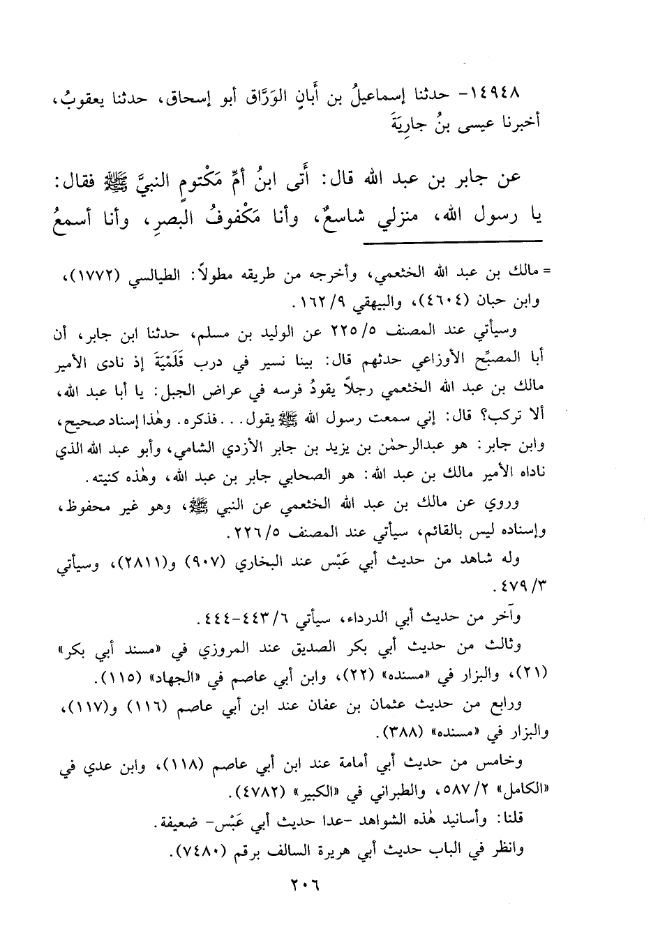 وسيأتي عند المصنف ٥/٢٢٥ عن الوليد بن مسلم، حدثنا ابن جابر، أن أبا المصبِّح الأوزاعي حدثهم قال: بينا نسير في درب قَلَمْيَةَ إذ نادى الأمير مالك بن عبد الله الخثعمي رجلاً يقودُ فرسه في عراض الجبل: يا أبا عبد الله، ألا تركب؟ قال: إني سمعت رسول الله صَلَّى اللهُ عَلَيْهِ وَسَلَّمَ يقول ... فذكره. وهذا إسناد صحيح، وابن جابر: هو عبد الرحمن بن يزيد بن جابر الأزدي الشامي، وأبو عبد الله الذي ناداه الأمير مالك بن عبد الله: هو الصحابي جابر بن عبد الله، وهذه كنيته.