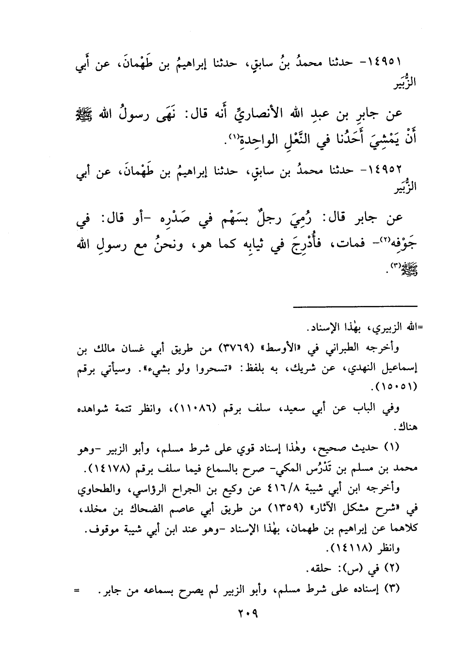 ١٤٩٥٢ - حَدَّثَنَا مُحَمَّدُ بْنُ سَابِقٍ، حَدَّثَنَا إِبْرَاهِيمُ بْنُ طَهْمَانَ، عَنْ أَبِي الزُّبَيْرِ، عَنْ جَابِرٍ، قَالَ: " رُمِيَ رَجُلٌ بِسَهْمٍ فِي صَدْرِهِ - أَوْ قَالَ: فِي جَوْفِهِ (٢) - فَمَاتَ، فَأُدْرِجَ فِي ثِيَابِهِ كَمَا هُوَ، وَنَحْنُ مَعَ رَسُولِ اللهِ صَلَّى اللهُ عَلَيْهِ وَسَلَّمَ " (٣)