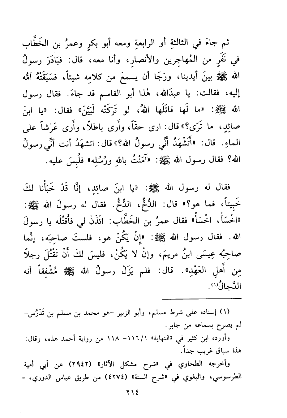 ثُمَّ جَاءَ فِي الثَّالِثَةِ أَوِ الرَّابِعَةِ وَمَعَهُ أَبُو بَكْرٍ، وَعُمَرُ بْنُ الْخَطَّابِ فِي نَفَرٍ مِنَ الْمُهَاجِرِينَ، وَالْأَنْصَارِ وَأَنَا مَعَهُ، قَالَ: فَبَادَرَ رَسُولُ اللهِ صَلَّى اللهُ عَلَيْهِ وَسَلَّمَ بَيْنَ أَيْدِينَا وَرَجَا أَنْ يَسْمَعَ مِنْ كَلَامِهِ شَيْئًا، فَسَبَقَتْهُ أُمُّهُ إِلَيْهِ، فَقَالَتْ: يَا عَبْدَ اللهِ هَذَا أَبُو الْقَاسِمِ قَدْ جَاءَ، فَقَالَ رَسُولُ اللهِ صَلَّى اللهُ عَلَيْهِ وَسَلَّمَ: " مَا لَهَا قَاتَلَهَا اللهُ لَوْ تَرَكَتْهُ لَبَيَّنَ " فَقَالَ: " يَا ابْنَ صَائِدٍ مَا تَرَى؟ " قَالَ: أَرَى حَقًّا، وَأَرَى بَاطِلًا، وَأَرَى عَرْشًا عَلَى الْمَاءِ، قَالَ: " أَتَشْهَدُ أَنِّي رَسُولُ اللهِ؟ " قَالَ: أَتَشْهَدُ أَنْتَ أَنِّي رَسُولُ اللهِ؟ فَقَالَ رَسُولُ اللهِ صَلَّى اللهُ عَلَيْهِ وَسَلَّمَ: " آمَنْتُ بِاللهِ وَرُسُلِهِ "، فَلُبِسَ عَلَيْهِ، فَقَالَ لَهُ رَسُولُ اللهِ صَلَّى اللهُ عَلَيْهِ وَسَلَّمَ: " يَا ابْنَ صَائِدٍ، إِنَّا قَدْ خَبَّأْنَا لَكَ خَبِيئًا فَمَا هُوَ؟ " قَالَ: الدُّخُّ الدُّخُّ، فَقَالَ لَهُ رَسُولُ اللهِ صَلَّى اللهُ عَلَيْهِ وَسَلَّمَ: " اخْسَأْ اخْسَأْ "، فَقَالَ عُمَرُ بْنُ الْخَطَّابِ: ائْذَنْ لِي فَأَقْتُلَهُ يَا رَسُولَ اللهِ، فَقَالَ رَسُولُ اللهِ صَلَّى اللهُ عَلَيْهِ وَسَلَّمَ: " إِنْ يَكُنْ هُوَ فَلَسْتَ صَاحِبَهُ، إِنَّمَا صَاحِبُهُ عِيسَى ابْنُ مَرْيَمَ، وَإِنْ لَا يَكُنْ، فَلَيْسَ لَكَ أَنْ تَقْتُلَ رَجُلًا مِنْ أَهْلِ الْعَهْدِ "، قَالَ: فَلَمْ يَزَلْ رَسُولُ اللهِ صَلَّى اللهُ عَلَيْهِ وَسَلَّمَ مُشْفِقًا أَنَّهُ الدَّجَّالُ (١)