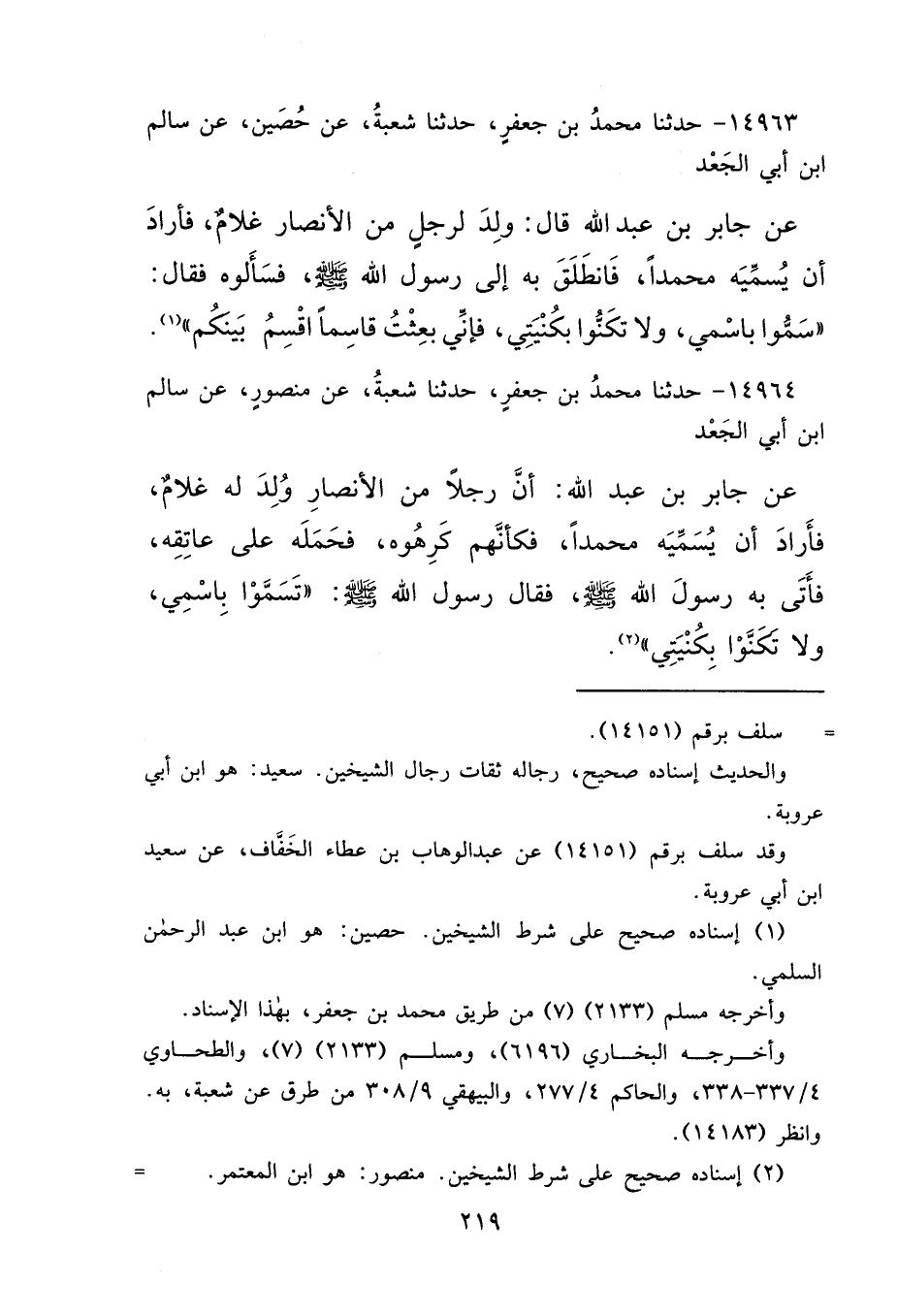 ١٤٩٦٤ - حَدَّثَنَا مُحَمَّدُ بْنُ جَعْفَرٍ، حَدَّثَنَا شُعْبَةُ، عَنْ مَنْصُورٍ، عَنْ سَالِمِ بْنِ أَبِي الْجَعْدِ، عَنْ جَابِرِ بْنِ عَبْدِ اللهِ، أَنَّ رَجُلًا مِنَ الْأَنْصَارِ وُلِدَ لَهُ غُلَامٌ، فَأَرَادَ أَنْ يُسَمِّيَهُ مُحَمَّدًا، فَكَأَنَّهُمْ كَرِهُوهُ، فَحَمَلَهُ عَلَى عَاتِقِهِ، فَأَتَى بِهِ رَسُولَ اللهِ صَلَّى اللهُ عَلَيْهِ وَسَلَّمَ، فَقَالَ رَسُولُ اللهِ صَلَّى اللهُ عَلَيْهِ وَسَلَّمَ: " تَسَمَّوْا بِاسْمِي، وَلَا تَكَنَّوْا بِكُنْيَتِي " (٢)
