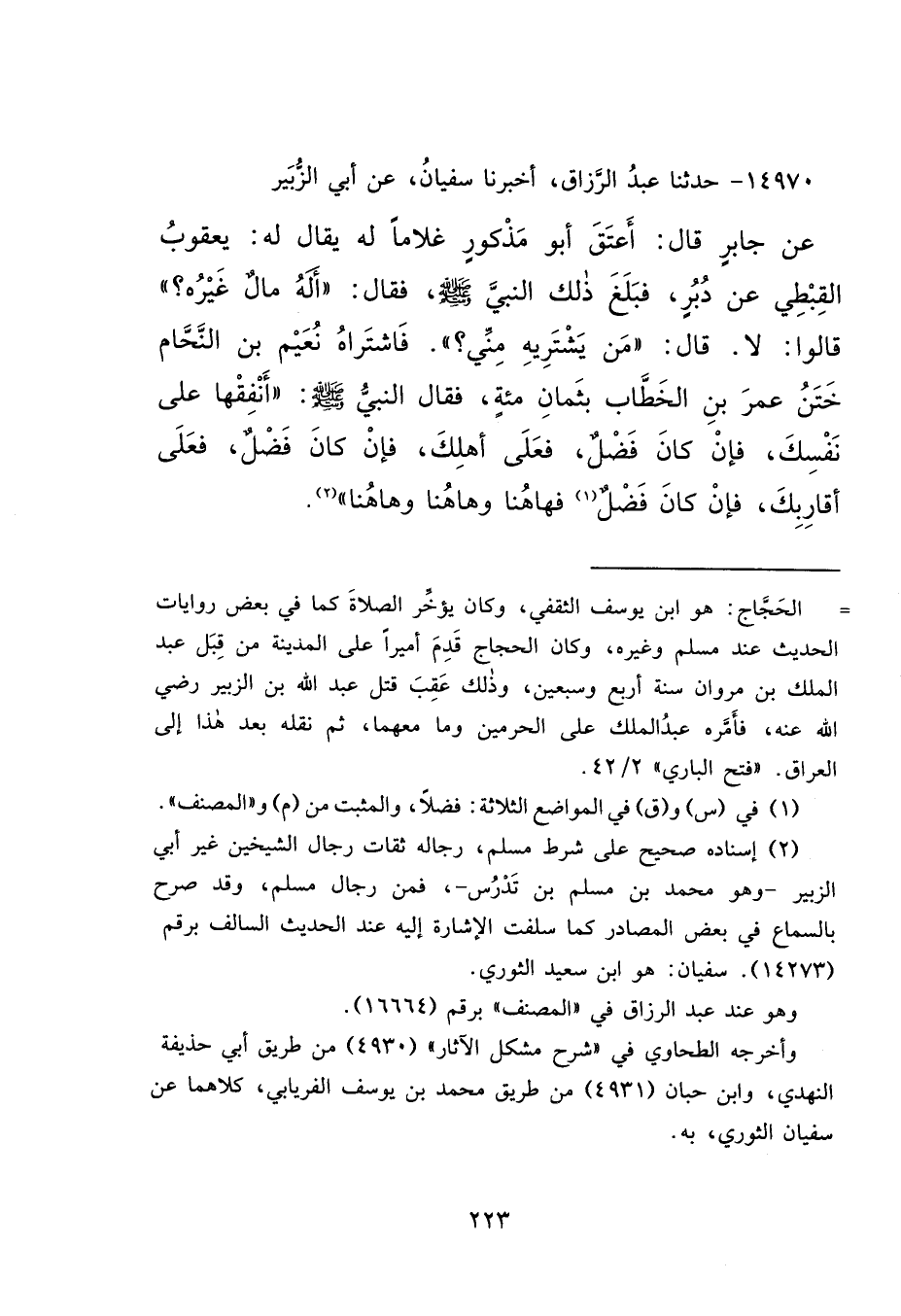 ١٤٩٧٠ - حَدَّثَنَا عَبْدُ الرَّزَّاقِ، أَخْبَرَنَا سُفْيَانُ، عَنْ أَبِي الزُّبَيْرِ، عَنْ جَابِرٍ، قَالَ: أَعْتَقَ أَبُو مَذْكُورٍ غُلَامًا لَهُ يُقَالَ لَهُ: يَعْقُوبُ الْقِبْطِيُّ عَنْ دُبُرٍ، فَبَلَغَ ذَلِكَ النَّبِيَّ صَلَّى اللهُ عَلَيْهِ وَسَلَّمَ، فَقَالَ: " أَلَهُ مَالٌ غَيْرُهُ؟ " قَالَوا: لَا، قَالَ: " مَنْ يَشْتَرِيهِ مِنِّي؟ " فَاشْتَرَاهُ نُعَيْمُ بْنُ النَّحَّامِ خَتَنُ عُمَرَ بْنِ الْخَطَّابِ بِثَمَانِ مِائَةٍ، فَقَالَ النَّبِيُّ صَلَّى اللهُ عَلَيْهِ وَسَلَّمَ: " أَنْفِقْهَا عَلَى نَفْسِكَ، فَإِنْ كَانَ فَضْلٌ، فَعَلَى أَهْلِكَ، فَإِنْ كَانَ فَضْلٌ، فَعَلَى أَقَارِبِكَ، فَإِنْ كَانَ فَضْلٌ، (١) فَهَاهُنَا وَهَاهُنَا وَهَاهُنَا " (٢)