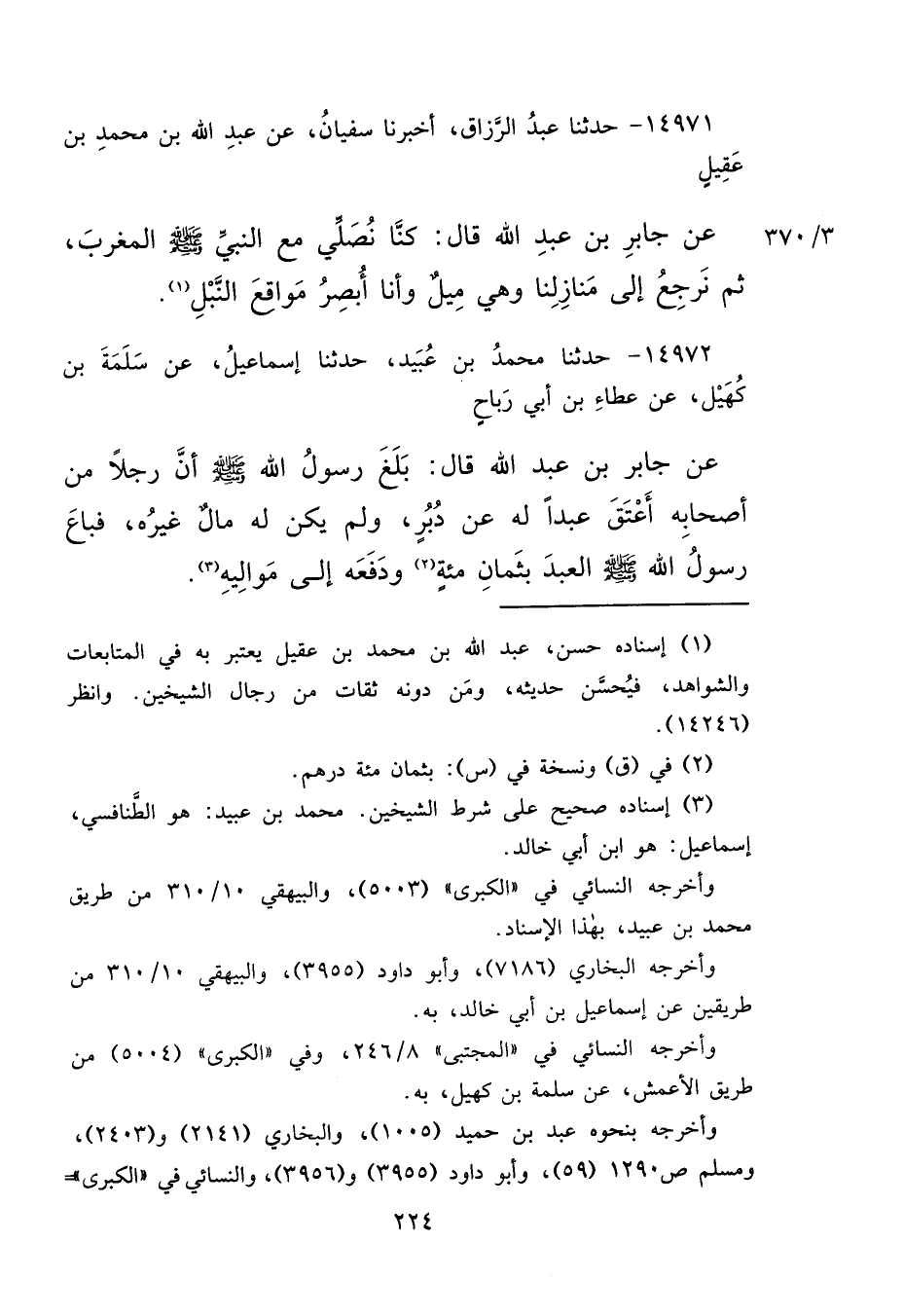 ١٤٩٧٢ - حَدَّثَنَا مُحَمَّدُ بْنُ عُبَيْدٍ، حَدَّثَنَا إِسْمَاعِيلُ، عَنْ سَلَمَةَ بْنِ كُهَيْلٍ، عَنْ عَطَاءِ بْنِ أَبِي رَبَاحٍ، عَنْ جَابِر بْنِ عَبْدِ اللهِ، قَالَ: " بَلَغَ رَسُولَ اللهِ صَلَّى اللهُ عَلَيْهِ وَسَلَّمَ أَنَّ رَجُلًا مِنْ أَصْحَابِهِ أَعْتَقَ عَبْدًا لَهُ عَنْ دُبُرٍ، وَلَمْ يَكُنْ لَهُ مَالٌ غَيْرُهُ، فَبَاعَ رَسُولُ اللهِ صَلَّى اللهُ عَلَيْهِ وَسَلَّمَ الْعَبْدَ بِثَمَانِ مِائَةٍ، (٢) وَدَفَعَهُ إِلَى مَوَالِيهِ " (٣)