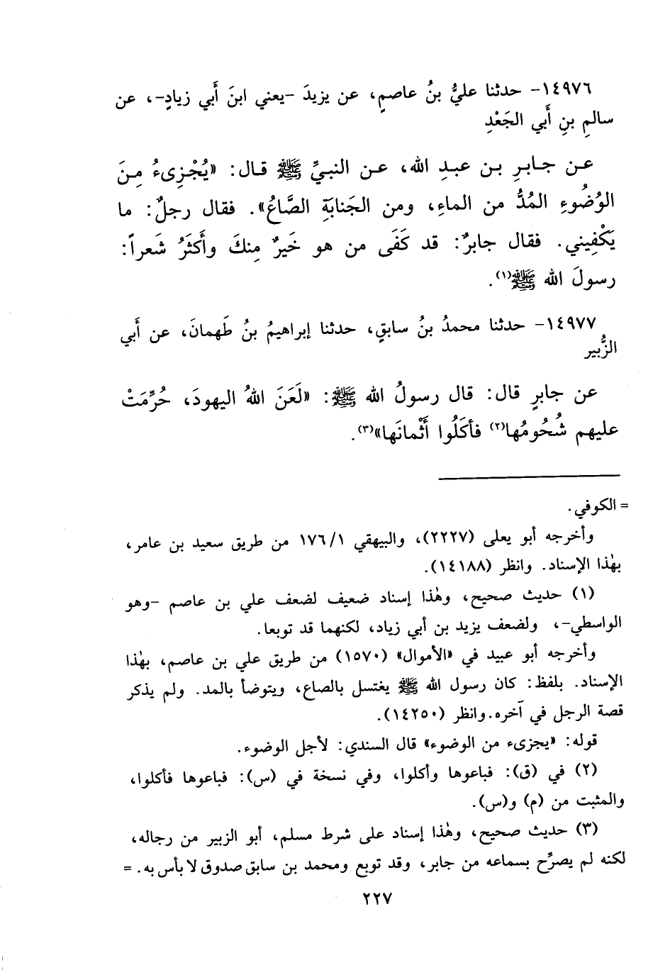 ١٤٩٧٦ - حَدَّثَنَا عَلِيُّ بْنُ عَاصِمٍ، عَنْ يَزِيدَ يَعْنِي ابْنَ أَبِي زِيَادٍ، عَنْ سَالِمِ بْنِ أَبِي الْجَعْدِ، عَنْ جَابِرِ بْنِ عَبْدِ اللهِ، عَنِ النَّبِيِّ صَلَّى اللهُ عَلَيْهِ وَسَلَّمَ قَالَ: " يُجْزِئُ مِنَ الْوَضُوءِ الْمُدُّ مِنَ الْمَاءِ، وَمِنَ الْجَنَابَةِ الصَّاعُ "، فَقَالَ رَجُلٌ: مَا يَكْفِينِي، فَقَالَ جَابِرٌ: " قَدْ كَفَى مَنْ هُوَ خَيْرٌ مِنْكَ، وَأَكْثَرُ شَعْرًا رَسُولَ اللهِ صَلَّى اللهُ عَلَيْهِ وَسَلَّمَ " (١)