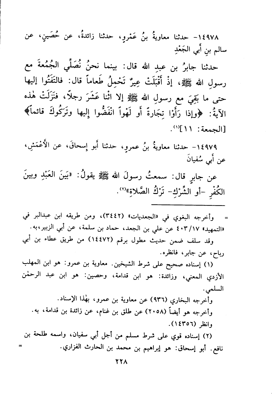 ١٤٩٧٨ - حَدَّثَنَا مُعَاوِيَةُ بْنُ عَمْرٍو، حَدَّثَنَا زَائِدَةُ، عَنْ حُصَيْنٍ، عَنْ سَالِمِ بْنِ أَبِي الْجَعْدِ، حَدَّثَنَا جَابِرُ بْنُ عَبْدِ اللهِ، قَالَ: " بَيْنَمَا نَحْنُ نُصَلِّي الْجُمُعَةَ مَعَ رَسُولِ اللهِ صَلَّى اللهُ عَلَيْهِ وَسَلَّمَ، إِذْ أَقْبَلَتْ عِيرٌ تَحْمِلُ طَعَامًا "، قَالَ: " فَالْتَفَتُوا إِلَيْهَا حَتَّى مَا بَقِيَ مَعَ رَسُولِ اللهِ صَلَّى اللهُ عَلَيْهِ وَسَلَّمَ، إِلَّا اثْنَا عَشَرَ رَجُلًا، فَنَزَلَتْ هَذِهِ الْآيَةُ: {وَإِذَا رَأَوْا تِجَارَةً أَوْ لَهْوًا انْفَضُّوا إِلَيْهَا وَتَرَكُوكَ قَائِمًا} [الجمعة: ١١] " (١)
