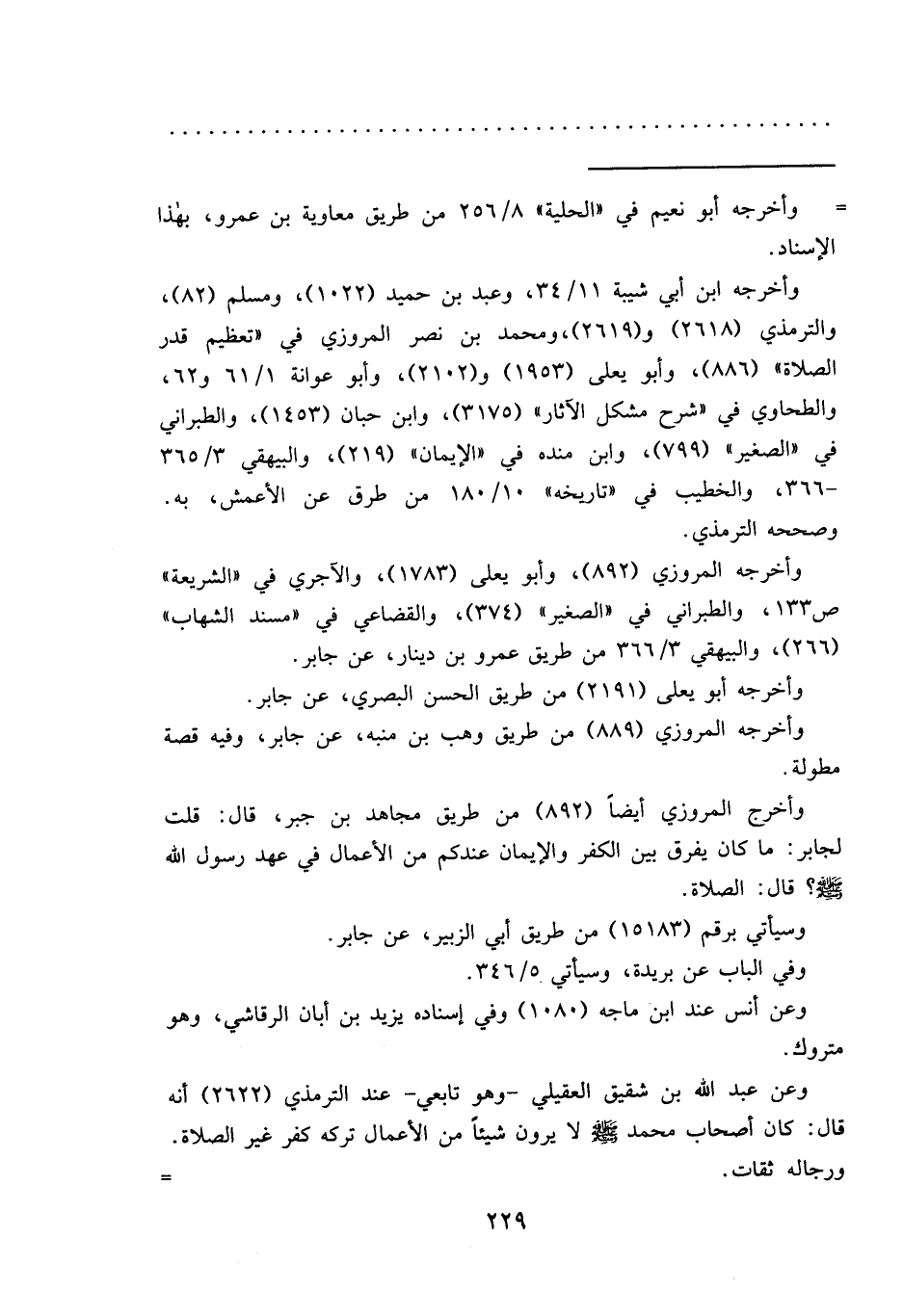 وأخرج المروزي أيضاً (٨٩٢) من طريق مجاهد بن جبر، قال: قلت لجابر: ما كان يفرق بين الكفر والإيمان عندكم من الأعمال في عهد رسول الله صَلَّى اللهُ عَلَيْهِ وَسَلَّمَ؟ قال: الصلاة.
