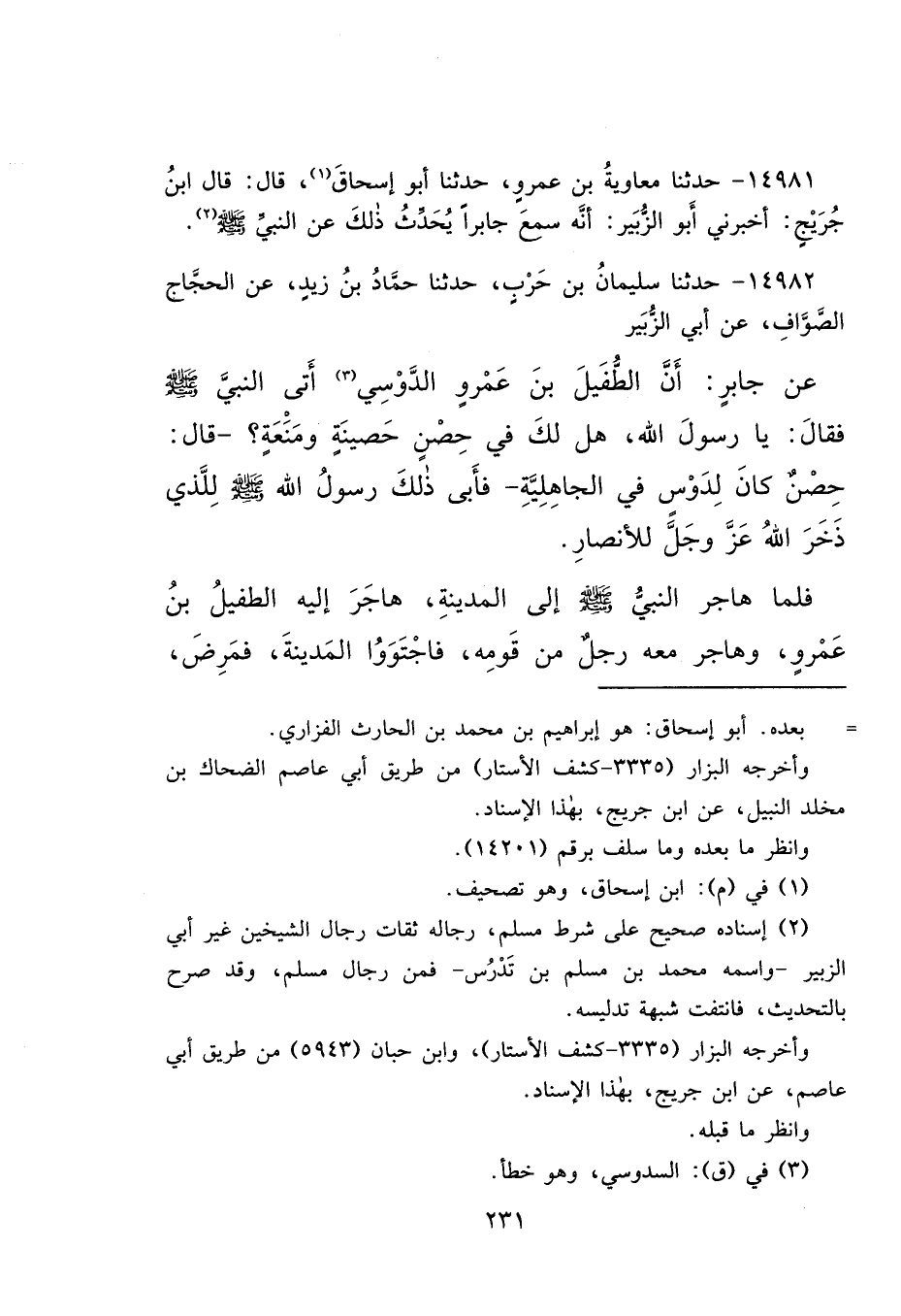 ١٤٩٨٢ - حَدَّثَنَا سُلَيْمَانُ بْنُ حَرْبٍ، حَدَّثَنَا حَمَّادُ بْنُ زَيْدٍ، عَنِ الْحَجَّاجِ الصَّوَّافِ، عَنْ أَبِي الزُّبَيْرِ، عَنْ جَابِرٍ، أَنَّ الطُّفَيْلَ بْنَ عَمْرٍو الدَّوْسِيَّ (٣) أَتَى النَّبِيَّ صَلَّى اللهُ عَلَيْهِ وَسَلَّمَ، فَقَالَ: يَا رَسُولَ اللهِ، هَلْ لَكَ فِي حِصْنٍ حَصِينَةٍ وَمَنْعَةٍ؟ - قَالَ: فَقَالَ: حِصْنٌ كَانَ لِدَوْسٍ فِي الْجَاهِلِيَّةِ - فَأَبَى ذَلِكَ رَسُولُ اللهِ صَلَّى اللهُ عَلَيْهِ وَسَلَّمَ لِلَّذِي ذَخَرَ اللهُ عَزَّ وَجَلَّ لِلْأَنْصَارِ، فَلَمَّا هَاجَرَ النَّبِيُّ صَلَّى اللهُ عَلَيْهِ وَسَلَّمَ إِلَى الْمَدِينَةِ، هَاجَرَ إِلَيْهِ الطُّفَيْلُ بْنُ عَمْرٍو، وَهَاجَرَ مَعَهُ رَجُلٌ مِنْ قَوْمِهِ، فَاجْتَوَوْا الْمَدِينَةَ، فَمَرِضَ،