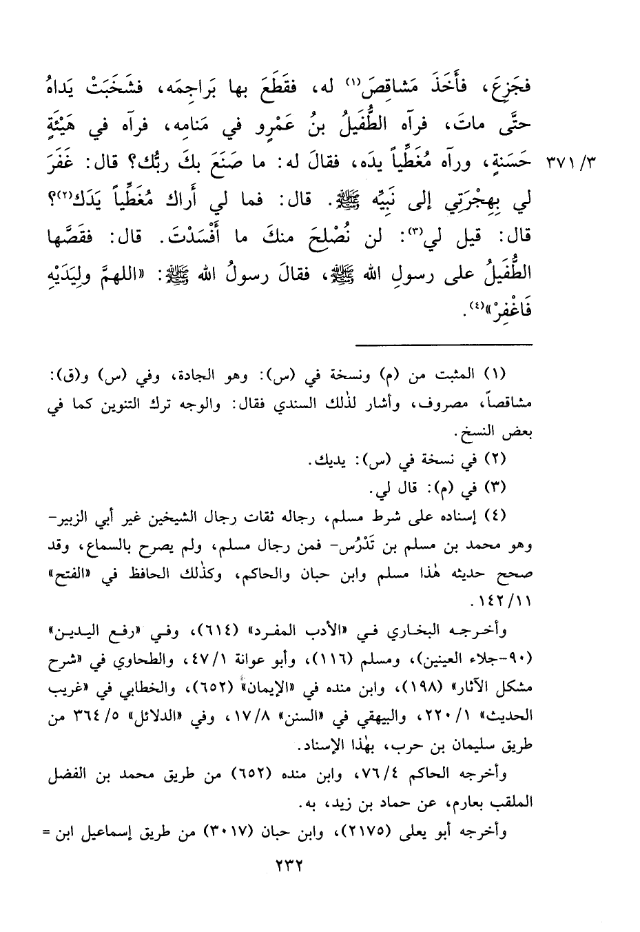 فَجَزِعَ، فَأَخَذَ مَشَاقِصَ (١) لَهُ، فَقَطَعَ بِهَا بَرَاجِمَهُ، فَشَخَبَتْ يَدَاهُ حَتَّى مَاتَ، فَرَآهُ الطُّفَيْلُ بْنُ عَمْرٍو فِي مَنَامِهِ، فَرَآهُ فِي هَيْئَةٍ حَسَنَةٍ، وَرَآهُ مُغَطِّيًا يَدَهُ، فَقَالَ لَهُ: مَا صَنَعَ بِكَ رَبُّكَ؟ قَالَ: غَفَرَ لِي بِهِجْرَتِي إِلَى نَبِيِّهِ صَلَّى اللهُ عَلَيْهِ وَسَلَّمَ، قَالَ: فَمَا لِي أَرَاكَ مُغَطِّيًا يَدَكَ؟ (٢) قَالَ: قِيلَ لِي: (٣) لَنْ نُصْلِحَ مِنْكَ مَا أَفْسَدْتَ، قَالَ: فَقَصَّهَا الطُّفَيْلُ عَلَى رَسُولِ اللهِ صَلَّى اللهُ عَلَيْهِ وَسَلَّمَ، فَقَالَ رَسُولُ اللهِ صَلَّى اللهُ عَلَيْهِ وَسَلَّمَ: " اللهُمَّ وَلِيَدَيْهِ، فَاغْفِرْ " (٤)