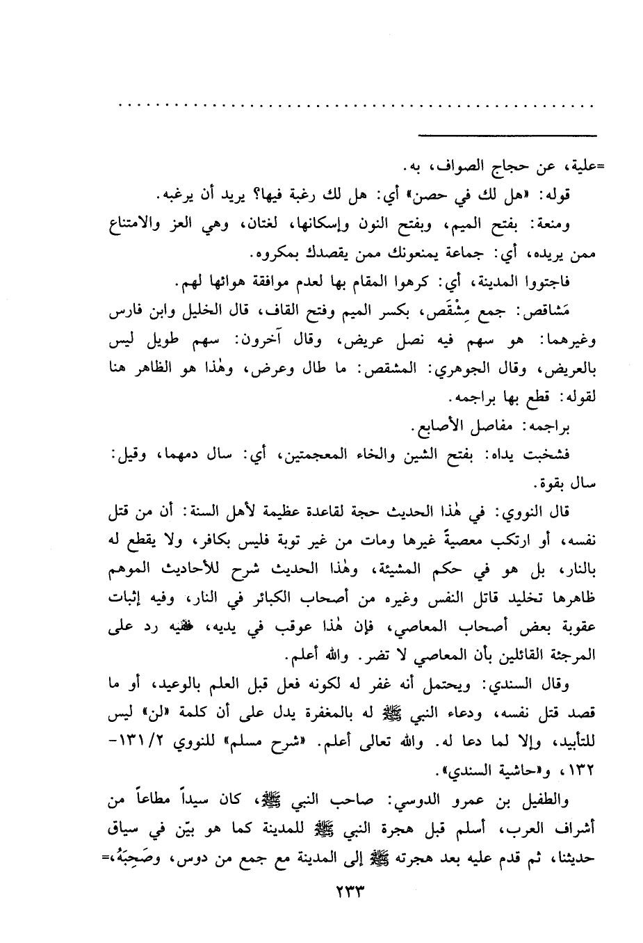 وقال السندي: ويحتمل أنه غفر له لكونه فعل قبل العلم بالوعيد، أو ما قصد قتل نفسه، ودعاء النبي صَلَّى اللهُ عَلَيْهِ وَسَلَّمَ له بالمغفرة يدل على أن كلمة "لن" ليس للتأبيد، وإلا لما دعا له. والله تعالى أعلم. "شرح مسلم" للنووي ٢/١٣١- ١٣٢، و"حاشية السندي".