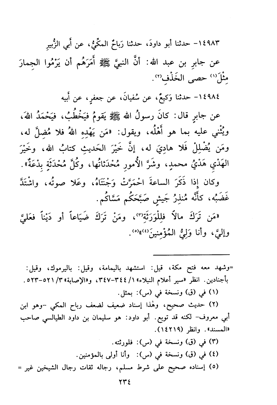 ١٤٩٨٤ - حَدَّثَنَا وَكِيعٌ، عَنْ سُفْيَانَ، عَنْ جَعْفَرٍ، عَنْ أَبِيهِ، عَنْ جَابِرٍ، قَالَ: كَانَ رَسُولُ اللهِ صَلَّى اللهُ عَلَيْهِ وَسَلَّمَ يَقُومُ، فَيَخْطُبُ، فَيَحْمَدُ اللهَ، وَيُثْنِي عَلَيْهِ بِمَا هُوَ أَهْلُهُ، وَيَقُولُ: " مَنْ يَهْدِهِ اللهُ فَلَا مُضِلَّ لَهُ، وَمَنْ يُضْلِلْ فَلَا هَادِيَ لَهُ، إِنَّ خَيْرَ الْحَدِيثِ كِتَابُ اللهِ، وَخَيْرَ الْهَدْيِ هَدْيُ مُحَمَّدٍ، وَشَرَّ الْأُمُورِ مُحْدَثَاتُهَا، وَكُلَّ مُحْدَثَةٍ بِدْعَةٌ "، وَكَانَ إِذَا ذَكَرَ السَّاعَةَ احْمَرَّتْ وَجْنَتَاهُ، وَعَلَا صَوْتُهُ، وَاشْتَدَّ غَضَبُهُ كَأَنَّهُ مُنْذِرُ جَيْشٍ، صَبَّحَكُمْ مَسَّاكُمْ. مَنْ تَرَكَ مَالًا فَلِلْوَرَثَةِ، (٣) وَمَنْ تَرَكَ ضَيَاعًا أَوْ دَيْنًا فَعَلَيَّ وَإِلَيَّ، وَأَنَا وَلِيُّ الْمُؤْمِنِينَ (٤) " (٥)