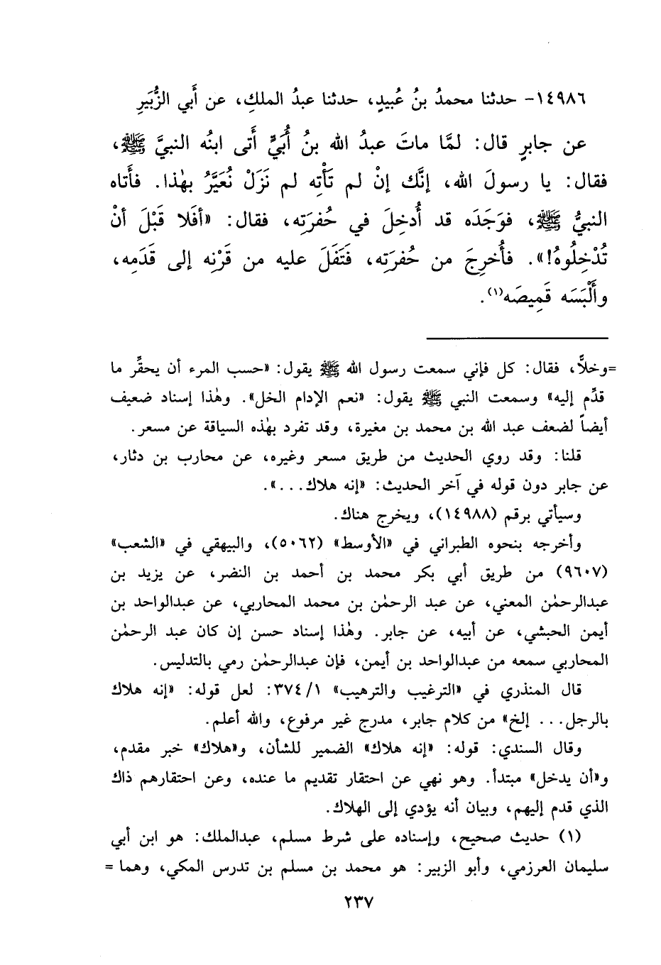 ١٤٩٨٦ - حَدَّثَنَا مُحَمَّدُ بْنُ عُبَيْدٍ، حَدَّثَنَا عَبْدُ الْمَلِكِ، عَنْ أَبِي الزُّبَيْرِ، عَنْ جَابِرٍ، قَالَ: لَمَّا مَاتَ عَبْدُ اللهِ بْنُ أُبَيٍّ أَتَى ابْنُهُ النَّبِيَّ صَلَّى اللهُ عَلَيْهِ وَسَلَّمَ، فَقَالَ: يَا رَسُولَ اللهِ، إِنَّكَ إِنْ لَمْ تَأْتِهِ لَمْ نَزَلْ نُعَيَّرُ بِهَذَا، فَأَتَاهُ النَّبِيُّ صَلَّى اللهُ عَلَيْهِ وَسَلَّمَ، فَوَجَدَهُ قَدْ أُدْخِلَ فِي حُفْرَتِهِ، فَقَالَ: " أَفَلَا قَبْلَ أَنْ تُدْخِلُوهُ "، فَأُخْرِجَ مِنْ حُفْرَتِهِ فَتَفَلَ عَلَيْهِ مِنْ قَرْنِهِ إِلَى قَدَمِهِ، وَأَلْبَسَهُ قَمِيصَهُ " (١)
