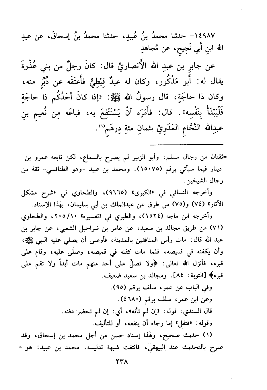١٤٩٨٧ - حَدَّثَنَا مُحَمَّدُ بْنُ عُبَيْدٍ، حَدَّثَنَا مُحَمَّدُ بْنُ إِسْحَاقَ، عَنْ عَبْدِ اللهِ بْنِ أَبِي نَجِيحٍ، عَنْ مُجَاهِدٍ، عَنْ جَابِرِ بْنِ عَبْدِ اللهِ الْأَنْصَارِيِّ، قَالَ: كَانَ رَجُلٌ مِنْ بَنِي عُذْرَةَ يُقَالَ لَهُ: أَبُو مَذْكُورٍ، وَكَانَ لَهُ عَبْدٌ قِبْطِيٌّ فَأَعْتَقَهُ عَنْ دُبُرٍ مِنْهُ، وَكَانَ ذَا حَاجَةٍ، قَالَ رَسُولُ اللهِ صَلَّى اللهُ عَلَيْهِ وَسَلَّمَ: " إِذَا كَانَ أَحَدُكُمْ ذَا حَاجَةٍ، فَلْيَبْدَأْ بِنَفْسِهِ "، قَالَ: فَأَمَرَهُ أَنْ يَسْتَنْفِعَ بِهِ، فَبَاعَهُ مِنْ نُعَيْمِ بْنِ عَبْدِ اللهِ النَّحَّامِ الْعَدَوِيِّ بِثَمَانِ مِائَةِ دِرْهَمٍ (١)