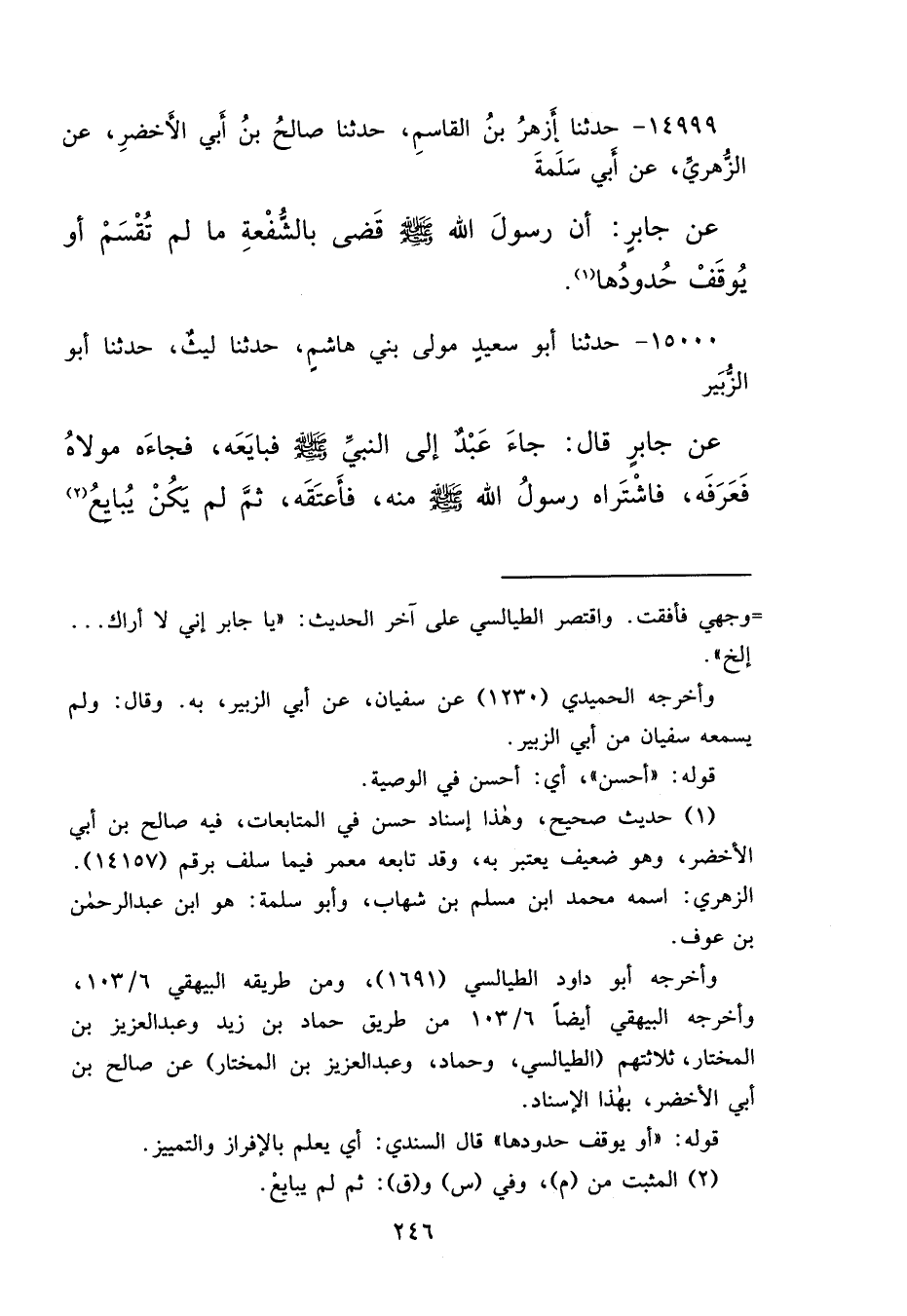 ١٤٩٩٩ - حَدَّثَنَا أَزْهَرُ بْنُ الْقَاسِمِ، حَدَّثَنَا صَالِحُ بْنُ أَبِي الْأَخْضَرِ، عَنِ الزُّهْرِيِّ، عَنْ أَبِي سَلَمَةَ، عَنْ جَابِرٍ: " أَنَّ رَسُولَ اللهِ صَلَّى اللهُ عَلَيْهِ وَسَلَّمَ قَضَى بِالشُّفْعَةِ مَا لَمْ تُقْسَمْ، أَوْ يُوقَفْ حُدُودُهَا " (١)