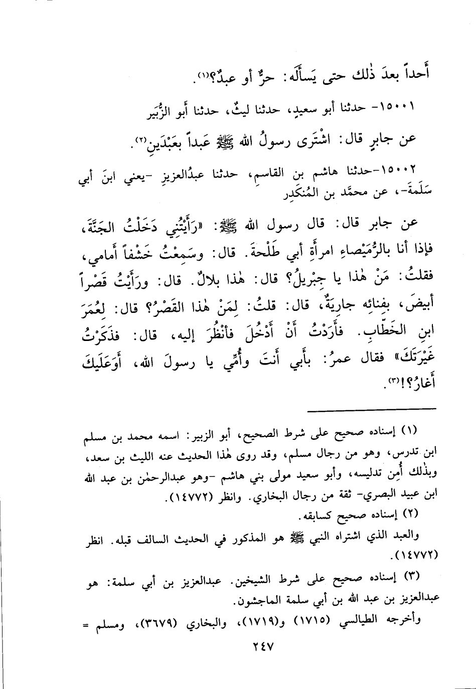 ١٥٠٠٢ - حَدَّثَنَا هَاشِمُ بْنُ الْقَاسِمِ، حَدَّثَنَا عَبْدُ الْعَزِيزِ يَعْنِي ابْنَ أَبِي سَلَمَةَ، عَنْ مُحَمَّدِ بْنِ الْمُنْكَدِرِ، عَنْ جَابِرٍ، قَالَ: قَالَ رَسُولُ اللهِ صَلَّى اللهُ عَلَيْهِ وَسَلَّمَ: " رَأَيْتُنِي دَخَلْتُ الْجَنَّةَ فَإِذَا أَنَا بِالرُّمَيْصَاءِ امْرَأَةِ أَبِي طَلْحَةَ "، قَالَ: " وَسَمِعْتُ خَشْفًا أَمَامِي، فَقُلْتُ: مَنْ هَذَا يَا جِبْرِيلُ؟ قَالَ: هَذَا بِلَالٌ، قَالَ: وَرَأَيْتُ قَصْرًا أَبْيَضَ بِفِنَائِهِ جَارِيَةٌ، قَالَ: قُلْتُ لِمَنْ هَذَا الْقَصْرُ؟ قَالَ لِعُمَرَ بْنِ الْخَطَّابِ: فَأَرَدْتُ أَنْ أَدْخُلَ فَأَنْظُرَ إِلَيْهِ " قَالَ: " فَذَكَرْتُ غَيْرَتَكَ " فَقَالَ عُمَرُ: بِأَبِي أَنْتَ وَأُمِّي يَا رَسُولَ اللهِ أَوَعَلَيْكَ أَغَارُ؟ (٣)