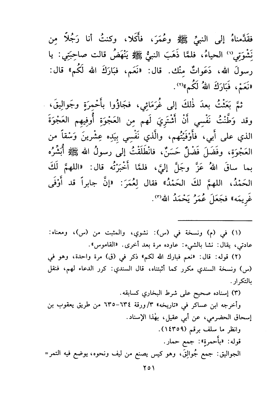 فَقَدَّمْنَاهُ إِلَى النَّبِيِّ صَلَّى اللهُ عَلَيْهِ وَسَلَّمَ وَعُمَرَ، فَأَكَلَا وَكُنْتُ أَنَا رَجُلًا مِنْ نِشْوَتِي (١) الْحَيَاءُ، فَلَمَّا ذَهَبَ النَّبِيُّ صَلَّى اللهُ عَلَيْهِ وَسَلَّمَ يَنْهَضُ، قَالَتْ صَاحِبَتِي: يَا رَسُولَ اللهِ، دَعَوَاتٌ مِنْكَ، قَالَ: " نَعَمْ، فَبَارَكَ اللهُ لَكُمْ " قَالَ: " نَعَمْ، فَبَارَكَ اللهُ لَكُمْ " (٢) ثُمَّ بَعَثْتُ بَعْدَ ذَلِكَ إِلَى غُرَمَائِي، فَجَاءُوا بِأَحْمِرَةٍ، وَجَوَالِيقَ وَقَدْ وَطَّنْتُ نَفْسِي أَنْ أَشْتَرِيَ لَهُمْ مِنَ الْعَجْوَةِ، أُوفِيهِمُ الْعَجْوَةَ الَّذِي عَلَى أَبِي، فَأَوْفَيْتُهُمْ وَالَّذِي نَفْسِي بِيَدِهِ عِشْرِينَ وَسْقًا مِنَ الْعَجْوَةِ، وَفَضَلَ فَضْلٌ حَسَنٌ، فَانْطَلَقْتُ إِلَى رَسُولِ اللهِ صَلَّى اللهُ عَلَيْهِ وَسَلَّمَ أُبَشِّرُهُ بِمَا سَاقَ اللهُ عَزَّ وَجَلَّ إِلَيَّ فَلَمَّا أَخْبَرْتُهُ قَالَ: " اللهُمَّ لَكَ الْحَمْدُ، اللهُمَّ لَكَ الْحَمْدُ " فَقَالَ لِعُمَرَ: " إِنَّ جَابِرًا قَدْ أَوْفَى غَرِيمَهُ "، فَجَعَلَ عُمَرُ يَحْمَدُ اللهَ (٣)