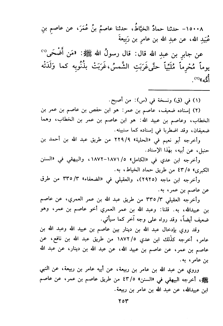 ١٥٠٠٨ - حَدَّثَنَا حَمَّادٌ الْخَيَّاطُ، حَدَّثَنَا عَاصِمُ بْنُ عُمَرَ، عَنْ عَاصِمِ بْنِ عُبَيْدِ اللهِ، عَنْ عَبْدِ اللهِ بْنِ عَامِرِ بْنِ رَبِيعَةَ، عَنْ جَابِرِ بْنِ عَبْدِ اللهِ، قَالَ: قَالَ رَسُولُ اللهِ صَلَّى اللهُ عَلَيْهِ وَسَلَّمَ: " مَنْ أَضْحَى (١) يَوْمًا مُحْرِمًا مُلَبِّيًا حَتَّى غَرَبَتِ الشَّمْسُ، غَرَبَتْ بِذُنُوبِهِ كَمَا وَلَدَتْهُ أُمُّهُ " (٢)