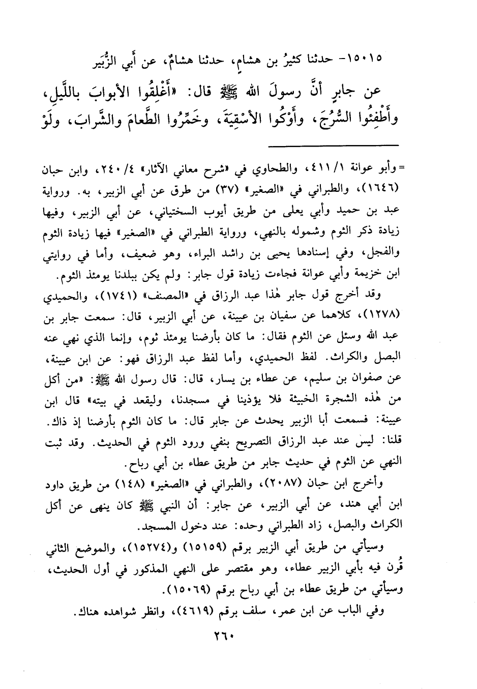١٥٠١٥ - حَدَّثَنَا كَثِيرُ بْنُ هِشَامٍ، حَدَّثَنَا هِشَامٌ، عَنْ أَبِي الزُّبَيْرِ، عَنْ جَابِرٍ، أَنَّ رَسُولَ اللهِ صَلَّى اللهُ عَلَيْهِ وَسَلَّمَ قَالَ: " أَغْلِقُوا الْأَبْوَابَ بِاللَّيْلِ، وَأَطْفِئُوا السُّرُجَ، وَأَوْكُوا الْأَسْقِيَةَ، وَخَمِّرُوا الطَّعَامَ وَالشَّرَابَ، وَلَوْ
