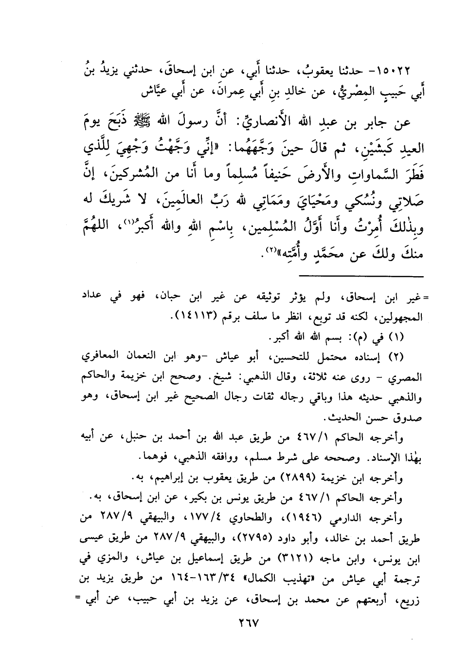 ١٥٠٢٢ - حَدَّثَنَا يَعْقُوبُ، حَدَّثَنَا أَبِي، عَنِ ابْنِ إِسْحَاقَ، حَدَّثَنِي يَزِيدُ بْنُ أَبِي حَبِيبٍ الْمِصْرِيُّ، عَنْ خَالِدِ بْنِ أَبِي عِمْرَانَ، عَنْ أَبِي عَيَّاشٍ، عَنْ جَابِرِ بْنِ عَبْدِ اللهِ الْأَنْصَارِيِّ، أَنَّ رَسُولَ اللهِ صَلَّى اللهُ عَلَيْهِ وَسَلَّمَ ذَبَحَ يَوْمَ الْعِيدِ كَبْشَيْنِ، ثُمَّ قَالَ حِينَ وَجَّهَهُمَا: " إِنِّي وَجَّهْتُ وَجْهِيَ لِلَّذِي فَطَرَ السَّمَوَاتِ وَالْأَرْضَ، حَنِيفًا مُسْلِمًا، وَمَا أَنَا مِنَ الْمُشْرِكِينَ، إِنَّ صَلَاتِي، وَنُسُكِي، وَمَحْيَايَ، وَمَمَاتِي لِلَّهِ رَبِّ الْعَالَمِينَ، لَا شَرِيكَ لَهُ، وَبِذَلِكَ أُمِرْتُ، وَأَنَا أَوَّلُ الْمُسْلِمِينَ، بِسْمِ اللهِ، واللهُ أَكْبَرُ، (١) اللهُمَّ مِنْكَ، وَلَكَ عَنْ مُحَمَّدٍ، وَأُمَّتِهِ " (٢)