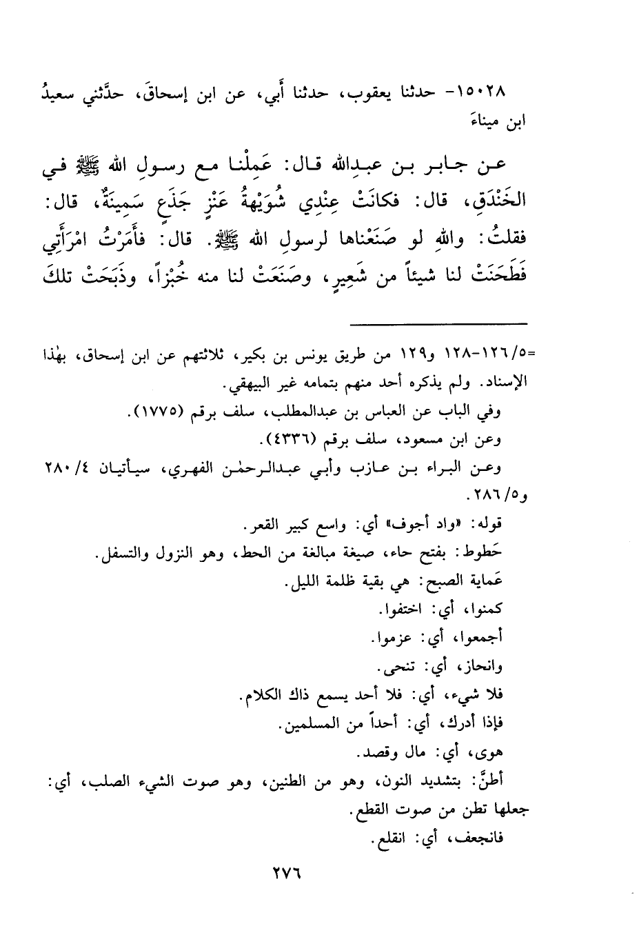 ١٥٠٢٨ - حَدَّثَنَا يَعْقُوبُ، حَدَّثَنَا أَبِي، عَنِ ابْنِ إِسْحَاقَ، حَدَّثَنِي سَعِيدُ بْنُ مِينَاءَ، عَنْ جَابِرِ بْنِ عَبْدِ اللهِ، قَالَ: عَمِلْنَا مَعَ رَسُولِ اللهِ صَلَّى اللهُ عَلَيْهِ وَسَلَّمَ فِي الْخَنْدَقِ، قَالَ: فَكَانَتْ عِنْدِي شُوَيْهَةُ عَنْزٍ جَذَعٌ سَمِينَةٌ، قَالَ: فَقُلْتُ: وَاللهِ لَوْ صَنَعْنَاهَا لِرَسُولِ اللهِ صَلَّى اللهُ عَلَيْهِ وَسَلَّمَ، قَالَ: فَأَمَرْتُ امْرَأَتِي فَطَحَنَتْ لَنَا شَيْئًا مِنْ شَعِيرٍ، وَصَنَعَتْ لَنَا مِنْهُ خُبْزًا، وَذَبَحَتْ تِلْكَ