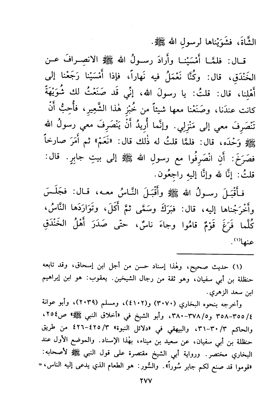 الشَّاةَ فَشَوَيْنَاهَا لِرَسُولِ اللهِ صَلَّى اللهُ عَلَيْهِ وَسَلَّمَ، قَالَ: فَلَمَّا أَمْسَيْنَا وَأَرَادَ رَسُولُ اللهِ صَلَّى اللهُ عَلَيْهِ وَسَلَّمَ الِانْصِرَافَ عَنِ الْخَنْدَقِ، قَالَ: وَكُنَّا نَعْمَلُ فِيهِ نَهَارًا، فَإِذَا أَمْسَيْنَا رَجَعْنَا إِلَى أَهْلِنَا، قَالَ: قُلْتُ: يَا رَسُولَ اللهِ قَدْ صَنَعْتُ لَكَ شُوَيْهَةً كَانَتْ عِنْدَنَا، وَصَنَعْنَا مَعَهَا شَيْئًا مِنْ خُبْزِ هَذَا الشَّعِيرِ، فَأُحِبُّ أَنْ تَنْصَرِفَ مَعِي إِلَى مَنْزِلِي، وَإِنَّمَا أُرِيدُ أَنْ يَنْصَرِفَ مَعِي رَسُولُ اللهِ صَلَّى اللهُ عَلَيْهِ وَسَلَّمَ وَحْدَهُ، قَالَ: فَلَمَّا قُلْتُ لَهُ ذَلِكَ قَالَ: " نَعَمْ "، ثُمَّ أَمَرَ صَارِخًا فَصَرَخَ: أَنْ انْصَرِفُوا مَعَ رَسُولِ اللهِ صَلَّى اللهُ عَلَيْهِ وَسَلَّمَ إِلَى بَيْتِ جَابِرٍ، قَالَ: قُلْتُ إِنَّا لِلَّهِ، وَإِنَّا إِلَيْهِ رَاجِعُونَ، فَأَقْبَلَ رَسُولُ اللهِ صَلَّى اللهُ عَلَيْهِ وَسَلَّمَ، وَأَقْبَلَ النَّاسُ مَعَهُ، قَالَ: فَجَلَسَ، وَأَخْرَجْنَاهَا إِلَيْهِ قَالَ: " فَبَرَكَ، وَسَمَّى، ثُمَّ أَكَلَ، وَتَوَارَدَهَا النَّاسُ كُلَّمَا فَرَغَ قَوْمٌ قَامُوا، وَجَاءَ نَاسٌ حَتَّى صَدَرَ أَهْلُ الْخَنْدَقِ عَنْهَا " (١)