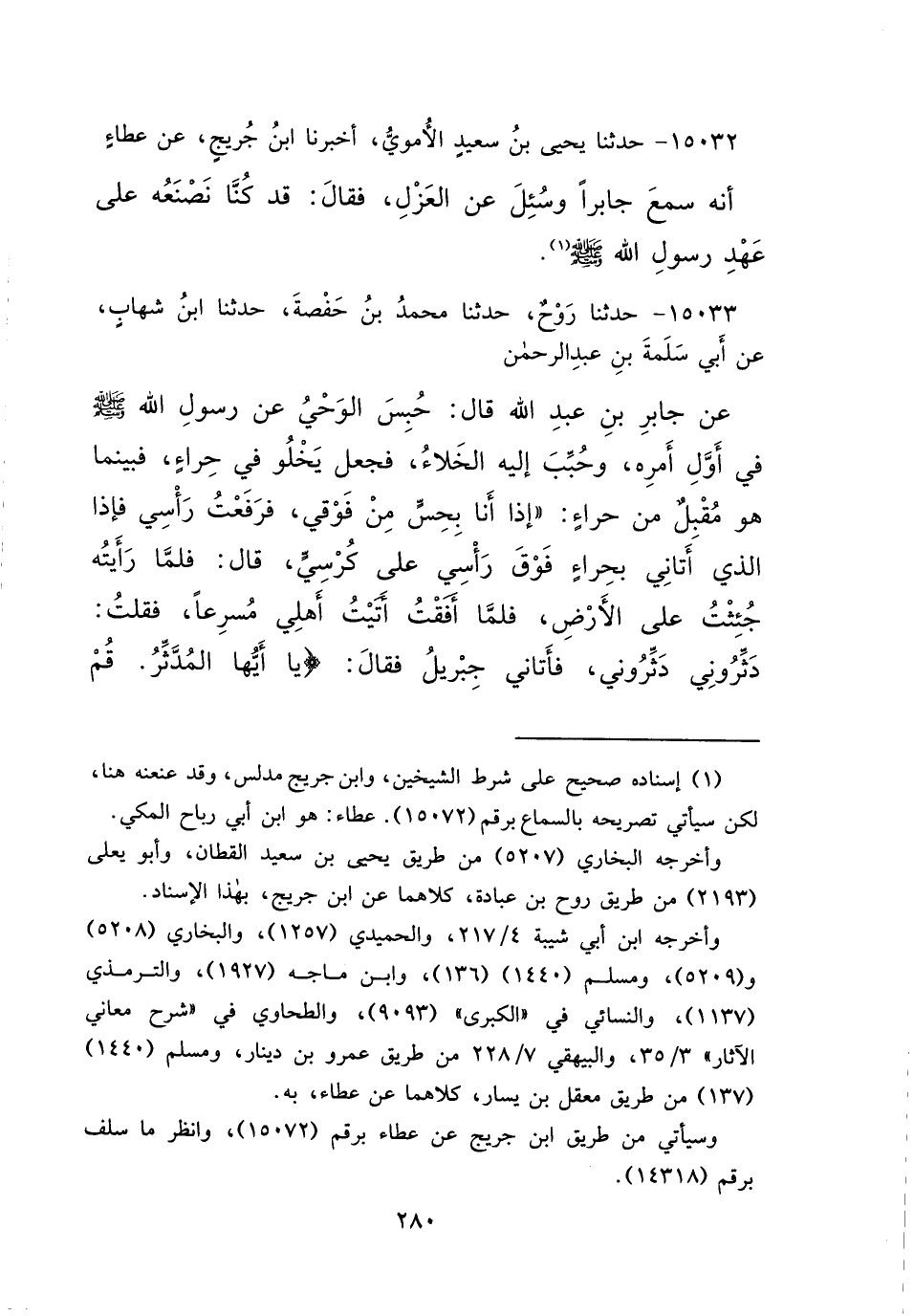 ١٥٠٣٣ - حَدَّثَنَا رَوْحٌ، حَدَّثَنَا مُحَمَّدُ بْنُ حَفْصَةَ، حَدَّثَنَا ابْنُ شِهَابٍ، عَنْ أَبِي سَلَمَةَ بْنِ عَبْدِ الرَّحْمَنِ، عَنْ جَابِرِ بْنِ عَبْدِ اللهِ، قَالَ: حُبِسَ الْوَحْيُ عَنْ رَسُولِ اللهِ صَلَّى اللهُ عَلَيْهِ وَسَلَّمَ فِي أَوَّلِ أَمْرِهِ وَحُبِّبَ إِلَيْهِ الْخَلَاءُ، فَجَعَلَ يَخْلُو فِي حِرَاءٍ، فَبَيْنَمَا هُوَ مُقْبِلٌ مِنْ حِرَاءٍ: " إِذَا أَنَا بِحِسٍّ مِنْ فَوْقِي، فَرَفَعْتُ رَأْسِي، فَإِذَا الَّذِي أَتَانِي بِحِرَاءٍ فَوْقَ رَأْسِي عَلَى كُرْسِيٍّ "، قَالَ: " فَلَمَّا رَأَيْتُهُ جُئِثْتُ عَلَى الْأَرْضِ فَلَمَّا أَفَقْتُ، أَتَيْتُ أَهْلِي مُسْرِعًا، فَقُلْتُ: دَثِّرُونِي، دَثِّرُونِي، فَأَتَانِي جِبْرِيلُ فَقَالَ: {يَا أَيُّهَا الْمُدَّثِّرُ، قُمْ