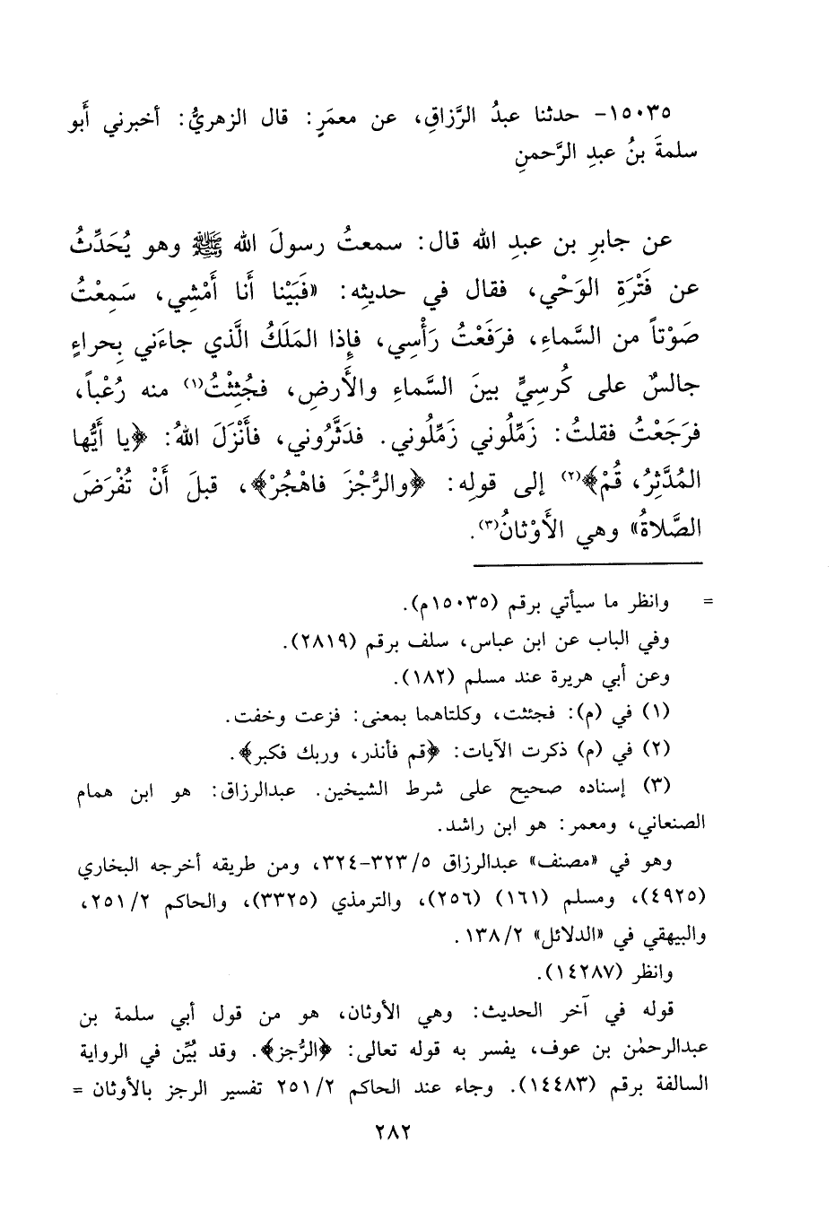 ١٥٠٣٥ - حَدَّثَنَا عَبْدُ الرَّزَّاقِ، عَنْ مَعْمَرٍ، قَالَ الزُّهْرِيُّ: أَخْبَرَنِي أَبُو سَلَمَةَ بْنُ عَبْدِ الرَّحْمَنِ، عَنْ جَابِرِ بْنِ عَبْدِ اللهِ، قَالَ: سَمِعْتُ رَسُولَ اللهِ صَلَّى اللهُ عَلَيْهِ وَسَلَّمَ، وَهُوَ يُحَدِّثُ عَنْ فَتْرَةِ الْوَحْيِ، فَقَالَ فِي حَدِيثِهِ: " فَبَيْنَا أَنَا أَمْشِي سَمِعْتُ صَوْتًا مِنَ السَّمَاءِ فَرَفَعْتُ رَأْسِي، فَإِذَا الْمَلَكُ الَّذِي جَاءَنِي بِحِرَاءٍ جَالِسٌ عَلَى كُرْسِيٍّ بَيْنَ السَّمَاءِ وَالْأَرْضِ، فَجُثِثْتُ (١) مِنْهُ رُعْبًا، فَرَجَعْتُ فَقُلْتُ: زَمِّلُونِي، زَمِّلُونِي فَدَثَّرُونِي، فَأَنْزَلَ اللهُ: {يَا أَيُّهَا الْمُدَّثِّرُ قُمْ} (٢) [المدثر: ٢] إِلَى قَوْلِهِ: {وَالرُّجْزَ فَاهْجُرْ} [المدثر: ٥] قَبْلَ أَنْ تُفْرَضَ الصَّلَاةُ، وَهِيَ الْأَوْثَانُ " (٣)