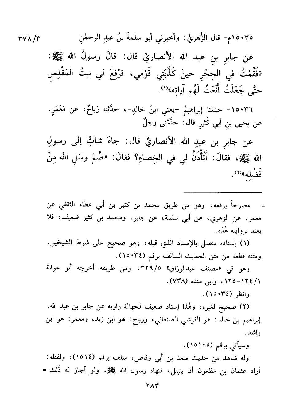 ١٥٠٣٦ - حَدَّثَنَا إِبْرَاهِيمُ يَعْنِي ابْنَ خَالِدٍ، حَدَّثَنَا رَبَاحٌ، عَنْ مَعْمَرٍ، عَنْ يَحْيَى بْنِ أَبِي كَثِيرٍ، قَالَ: حَدَّثَنِي رَجُلٌ، عَنْ جَابِرِ بْنِ عَبْدِ اللهِ الْأَنْصَارِيِّ، قَالَ: جَاءَ شَابٌّ إِلَى رَسُولِ اللهِ صَلَّى اللهُ عَلَيْهِ وَسَلَّمَ فَقَالَ: أَتَأْذَنُ لِي فِي الْخِصَاءِ؟ فَقَالَ: " صُمْ، وَسَلِ اللهَ مِنْ فَضْلِهِ " (٢)