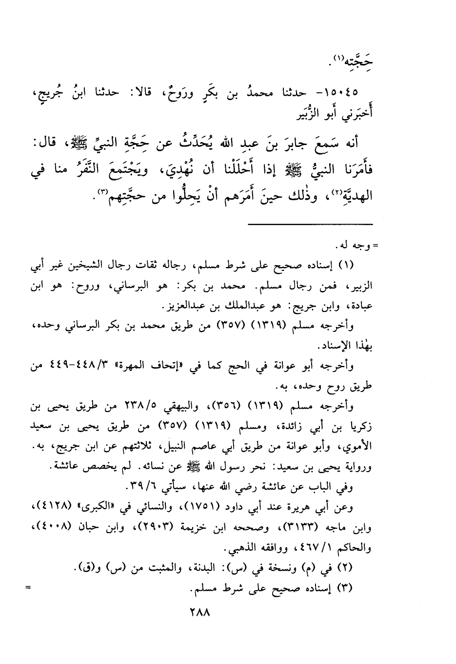 ١٥٠٤٥ - حَدَّثَنَا مُحَمَّدُ بْنُ بَكْرٍ، وَرَوْحٌ، قَالَا: حَدَّثَنَا ابْنُ جُرَيْجٍ، أَخْبَرَنِي أَبُو الزُّبَيْرِ، أَنَّهُ سَمِعَ جَابِرَ بْنَ عَبْدِ اللهِ، يُحَدِّثُ عَنْ حَجَّةِ النَّبِيِّ صَلَّى اللهُ عَلَيْهِ وَسَلَّمَ قَالَ: " فَأَمَرَنَا النَّبِيُّ صَلَّى اللهُ عَلَيْهِ وَسَلَّمَ إِذَا أَحْلَلْنَا أَنْ نُهْدِيَ، وَيَجْتَمِعُ النَّفَرُ مِنَّا فِي الْهَدِيَّةِ، (٢) وَذَلِكَ حِينَ أَمَرَهُمْ أَنْ يَحِلُّوا مِنْ حَجَّتِهِمْ " (٣)
