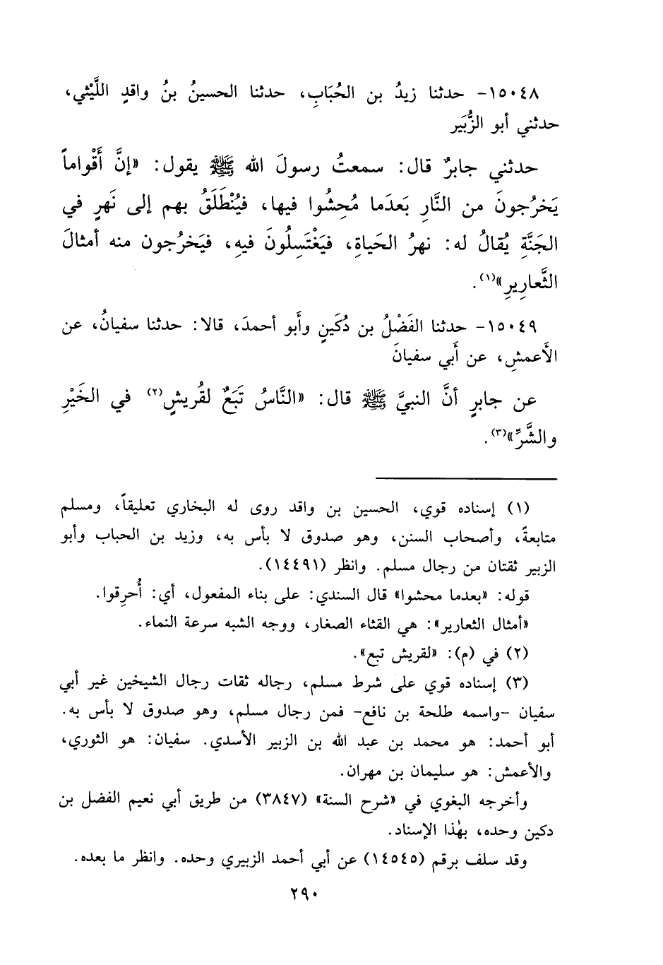 ١٥٠٤٨ - حَدَّثَنَا زَيْدُ بْنُ الْحُبَابِ، حَدَّثَنَا الْحُسَيْنُ بْنُ وَاقِدٍ اللَّيْثِيُّ، حَدَّثَنِي أَبُو الزُّبَيْرِ، حَدَّثَنِي جَابِرٌ، قَالَ: سَمِعْتُ رَسُولَ اللهِ صَلَّى اللهُ عَلَيْهِ وَسَلَّمَ يَقُولُ: " إِنَّ أَقْوَامًا يَخْرُجُونَ مِنَ النَّارِ بَعْدَمَا مُحِشُوا فِيهَا، فَيُنْطَلَقُ بِهِمْ إِلَى نَهْرٍ فِي الْجَنَّةِ، يُقَالُ لَهُ: نَهْرُ الْحَيَاةِ، فَيَغْتَسِلُونَ فِيهِ، فَيَخْرُجُونَ مِنْهُ أَمْثَالَ الثَّعَارِيرِ " (١)