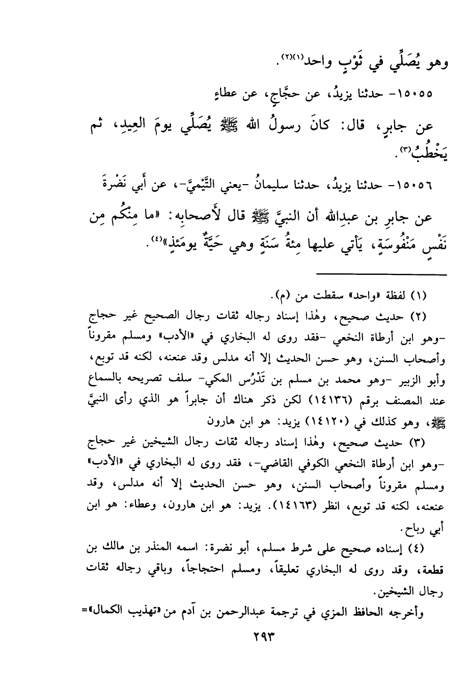 (٢) حديث صحيح، وهذا إسناد رجاله ثقات رجال الصحيح غير حجاج - وهو ابن أرطاة النخعي- فقد روى له البخاري في "الأدب" ومسلم مقروناً وأصحاب السنن، وهو حسن الحديث إلا أنه مدلس وقد عنعنه، لكنه قد توبع، وأبو الزبير- وهو محمد بن مسلم بن تَدْرُس المكي- سلف تصريحه بالسماع عند المصنف برقم (١٤١٣٦) لكن ذكر هناك أن جابراً هو الذي رأى النبي صَلَّى اللهُ عَلَيْهِ وَسَلَّمَ، وهو كذلك في (١٤١٢٠) يزيد: هو ابن هارون (٣) حديث صحيح، وهذا إسناد رجاله ثقات رجال الشيخين غير حجاج - وهو ابن أرطاة النخعي الكوفي القاضي-، فقد روى له البخاري في "الأدب" ومسلم مقروناً وأصحاب السنن، وهو حسن الحديث إلا أنه مدلس، وقد عنعنه، لكنه قد توبع، انظر (١٤١٦٣) . يزيد: هو ابن هارون، وعطاء: هو ابن أبي رباح.